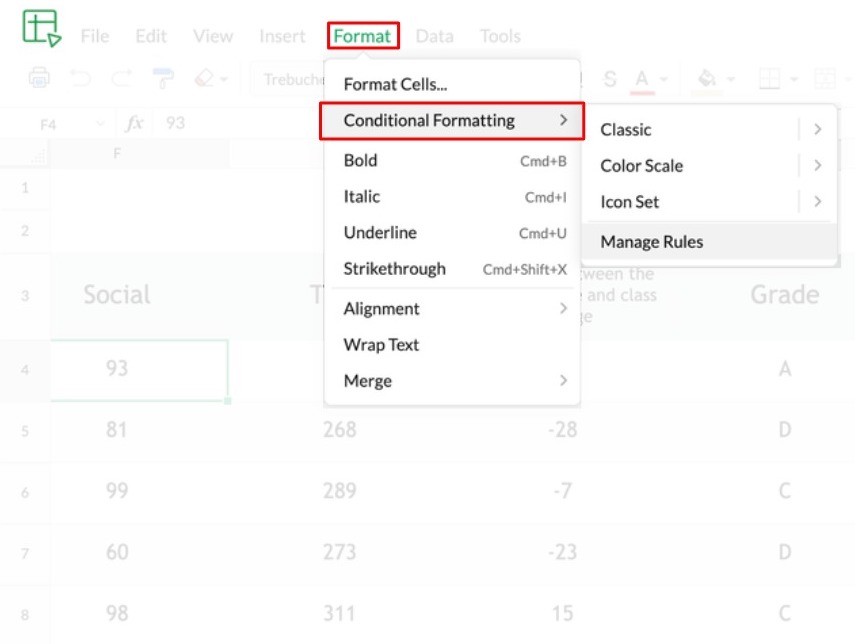条件付き書式設定を使用すると、特定の条件に基づいたセルの形式を事前に定義できます。Zoho Sheetは次の4種類の条件付き書式設定を提供しています: