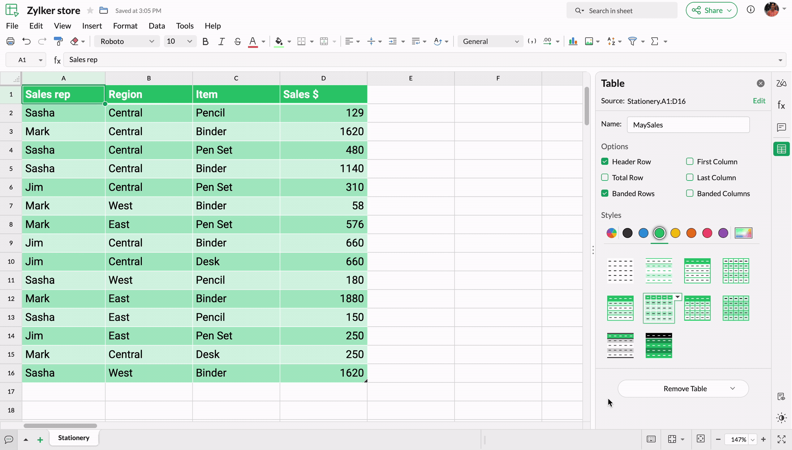 Delete Tableとフォーマットを保持を選択すると、テーブルスタイルは標準のセル範囲に変換され、関連する定義名も削除されます。しかしながら、範囲の外観は引き続きテーブルスタイルとして保たれ、それに適用されているセルフォーマットは変更されません。一方、Delete Table and Formatsを選択すると、テーブルスタイルは標準のセル範囲に変更され、フォーマットも含めた全てのテーブルが削除されます。