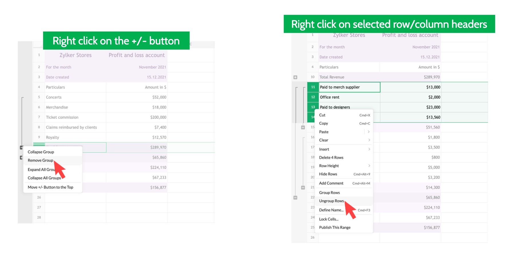 - グループ化解除したい行/列を選択します。行/列のヘッダー上で右クリックし、「行のグループ化解除/列のグループ化解除」のオプションをクリックします。