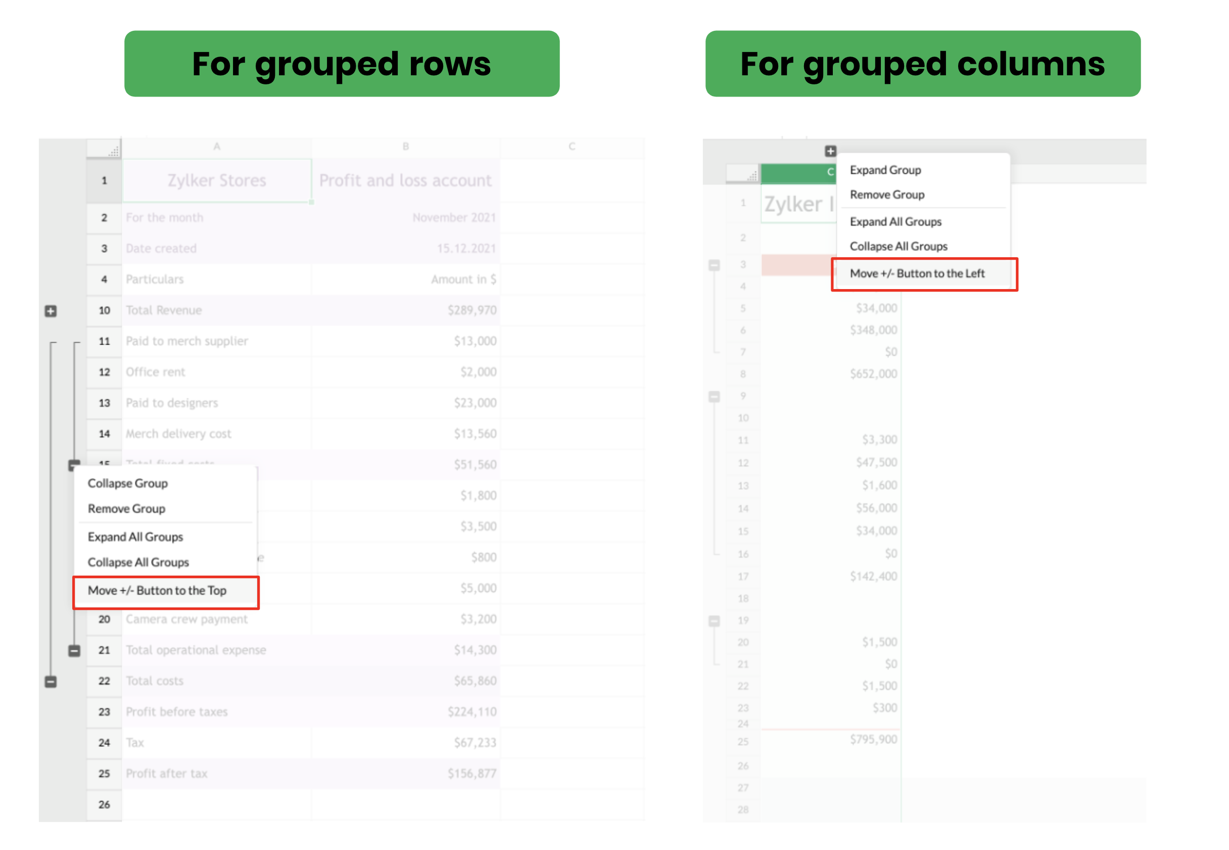 グループは、グループの右側の列またはグループの下の行で展開できるオプションがデフォルトで作成されます。展開・折りたたみボタンをグループの上側または左側に移動することを選ぶことができます。