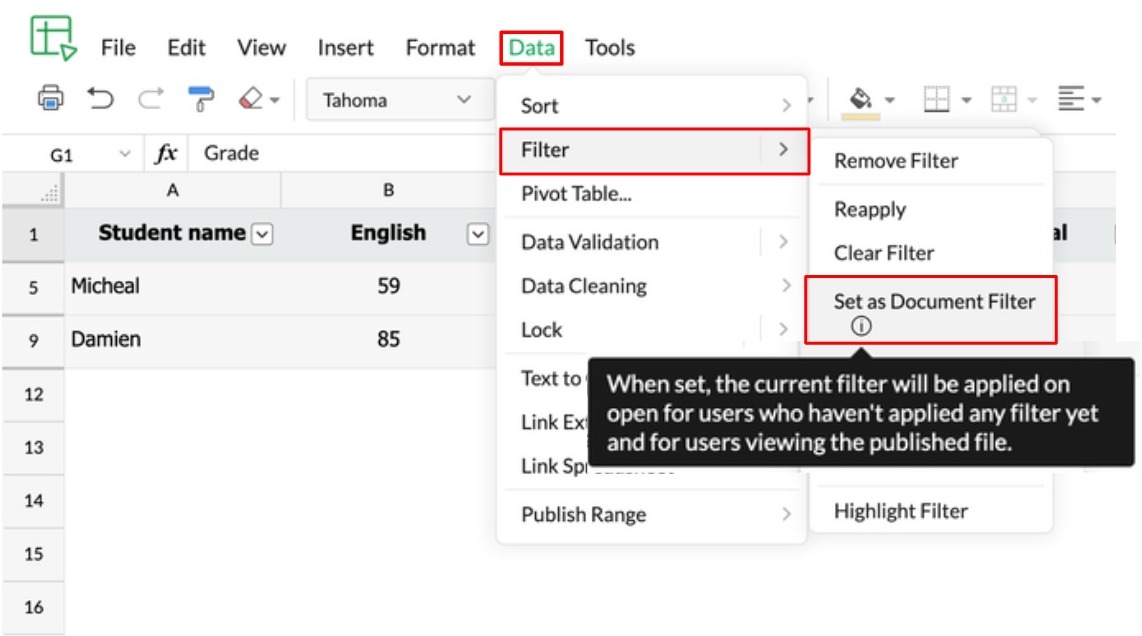 ドキュメント フィルターとしてフィルターを設定するということは、指定されたフィルターがフィルターが削除されるか別のものに置き換えられるまで、初めてスプレッドシートを開く全てのユーザーに対して初期化されることを意味します。公開されたファイル版にもドキュメント フィルターが