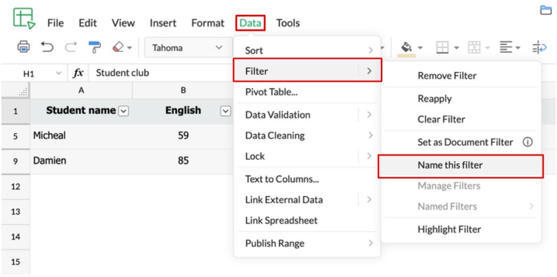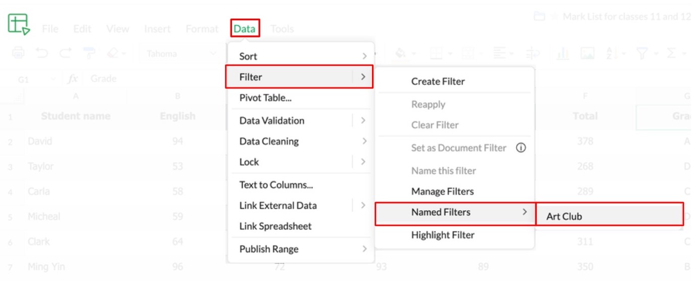 範囲にフィルターを適用した後、Zoho Sheetでは、後で簡単にアクセスできるように保存する機能があります