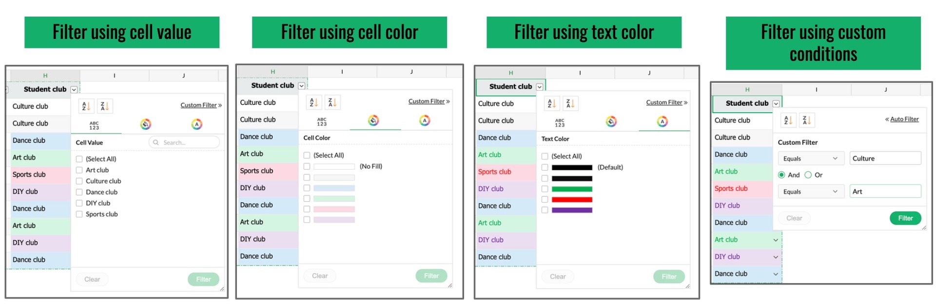 メモ:Zoho Sheetのフィルターは協働のために設計されています。範囲にフィルターを適用すると、適用されたフィルターは自分だけが確認でき、他の協力者は邪魔されることなく作業を続行できます。