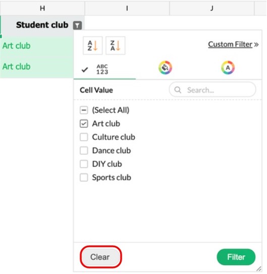 1. フィルター アイコンをクリックし、コンテキストメニューからクリア フィルターを選択する。