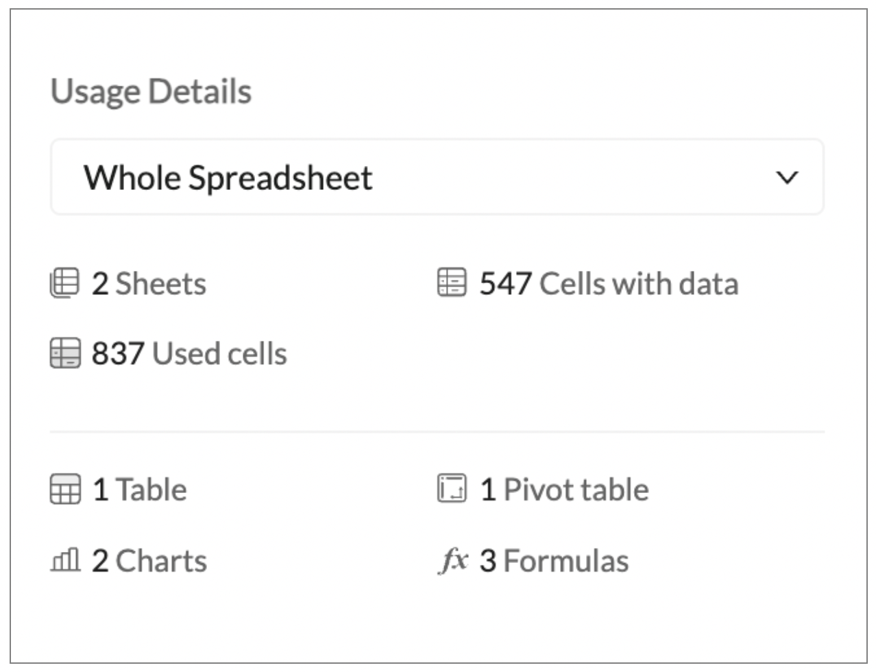 使用状況の統計には、セル、チャート、ピボットテーブル、数式の使用数などの情報が含まれています。これは、全体のスプレッドシートまたは特定のシートについて表示することができます。
