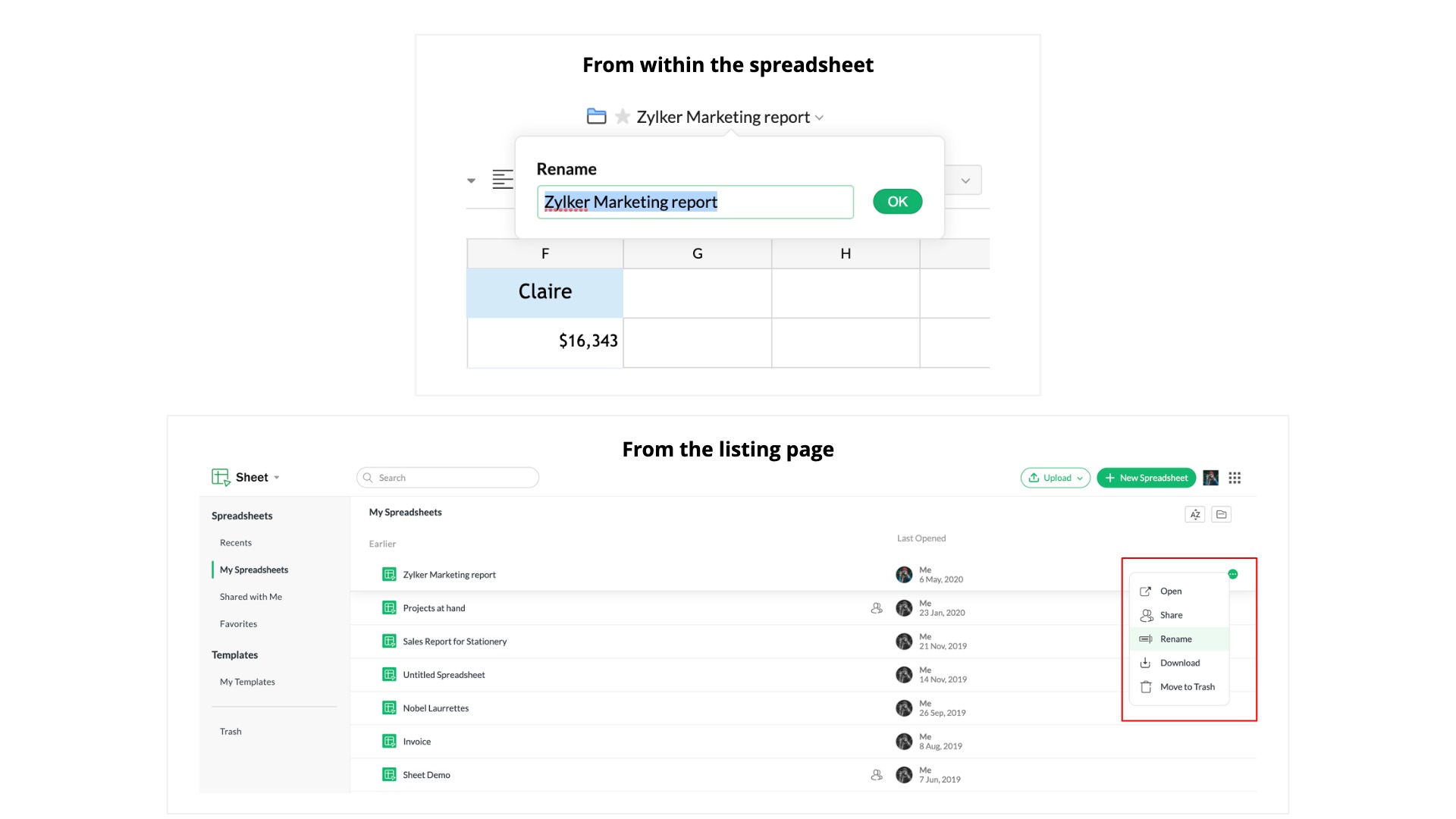 また、Zoho Sheetリスティングページからファイルを右クリックし、名前を変更するオプションを選択することで名前を変更できます。