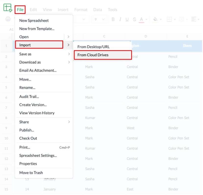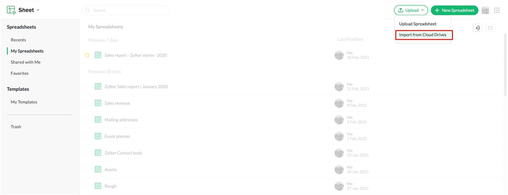 Zoho Sheetでは、Google Drive、Dropbox、OneDrive、箱などの他のクラウドドライブからスプレッドシートをインポートしたり、エクスポートしたりすることができます。以下に手順を示します。