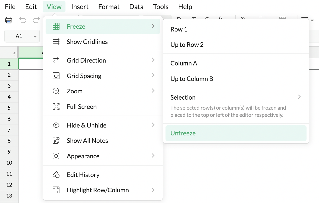 「表示する」をクリック >「固定」>「行 1」または「列 A」を選択します。