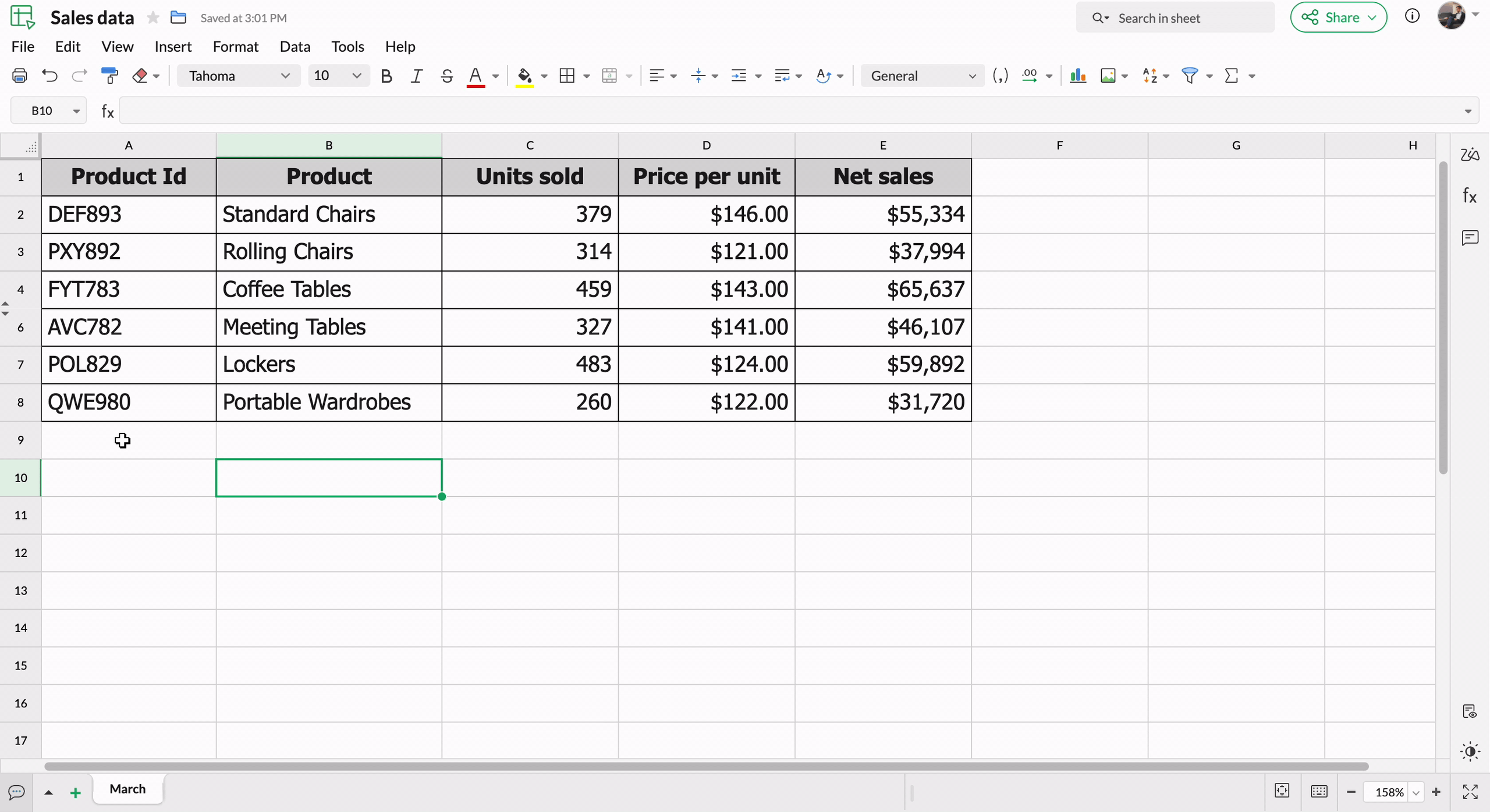 Zohoシートでは、非表示の行/列を緑の印で示していることに注意してください。