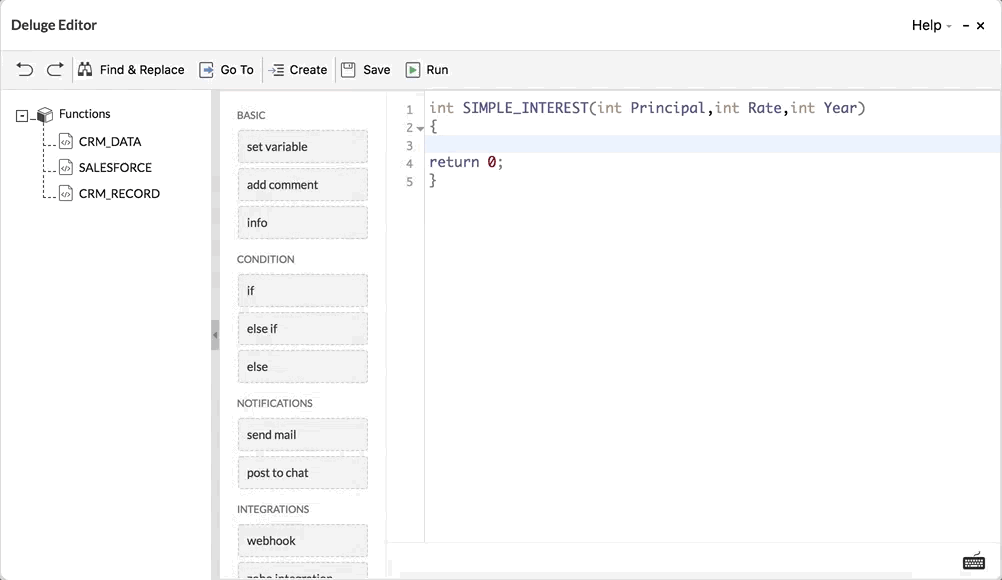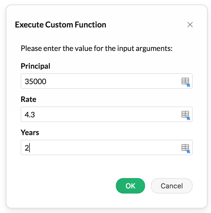 単純な利息を計算するためのサンプル関数です。この関数を使用するには、作成ダイアログで関数名「simple_interest」を入力し、次に示すコードをエディタにコピー&ペーストしてください: