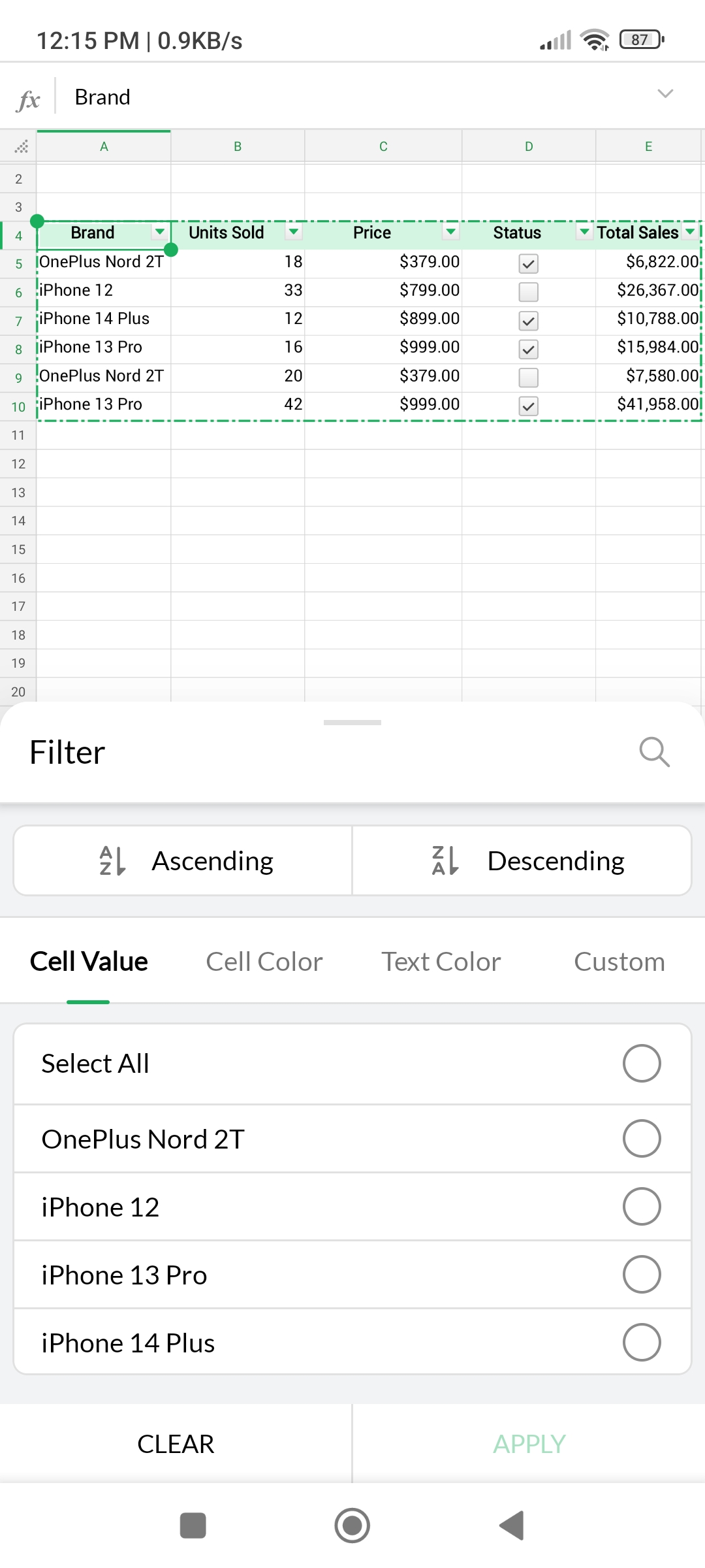 クリック on データフィルタリングの基準一覧(セル値、セル色、テキスト色など)にアクセスします。