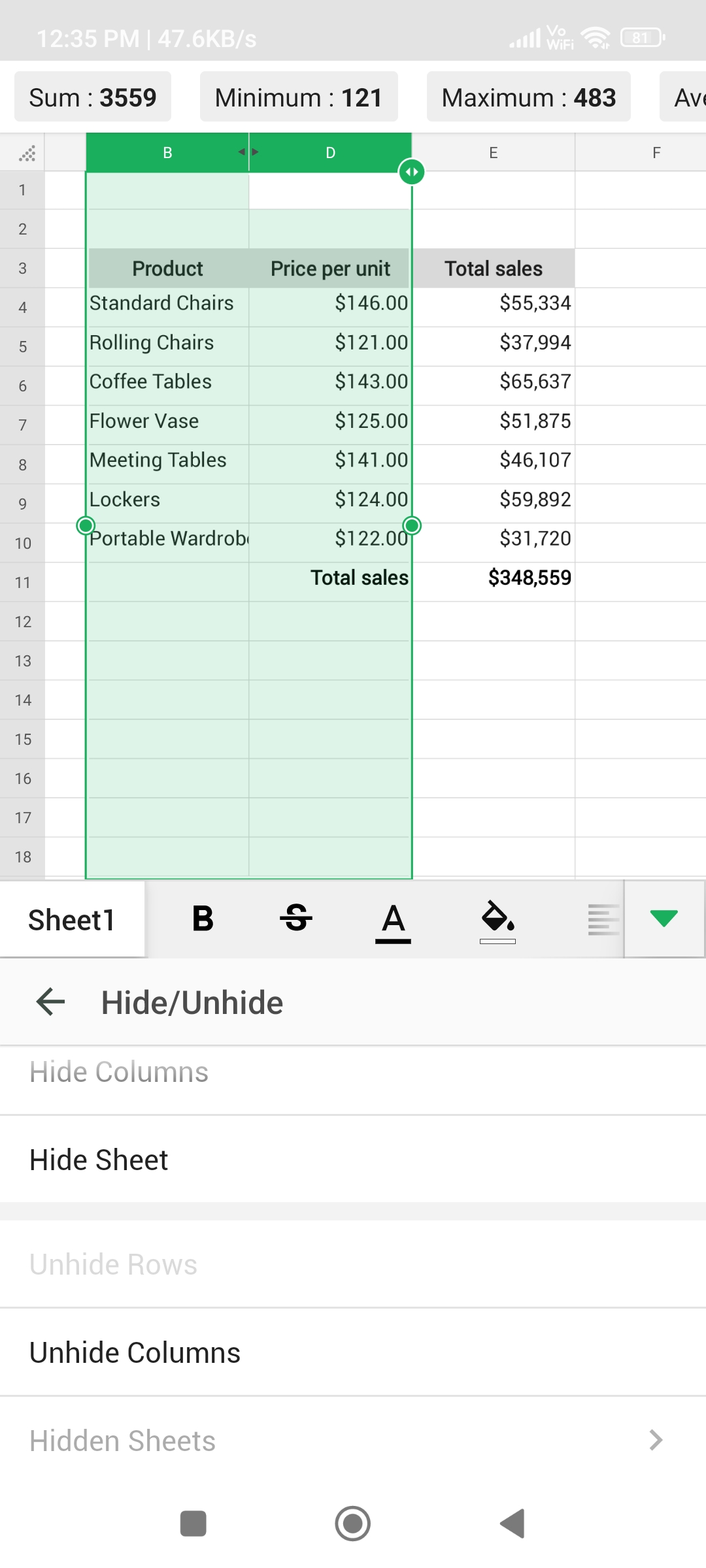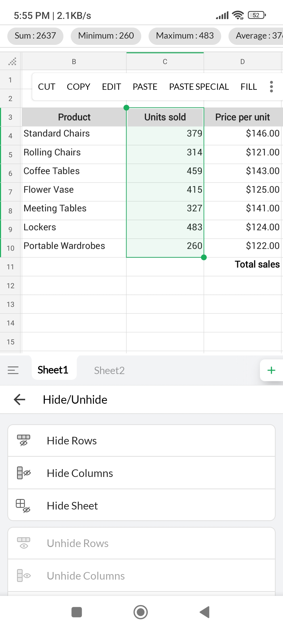 シートを表示するには、隠す/表示 メニューで、非表示の表計算シートのリストから表示したいシートを選択します。