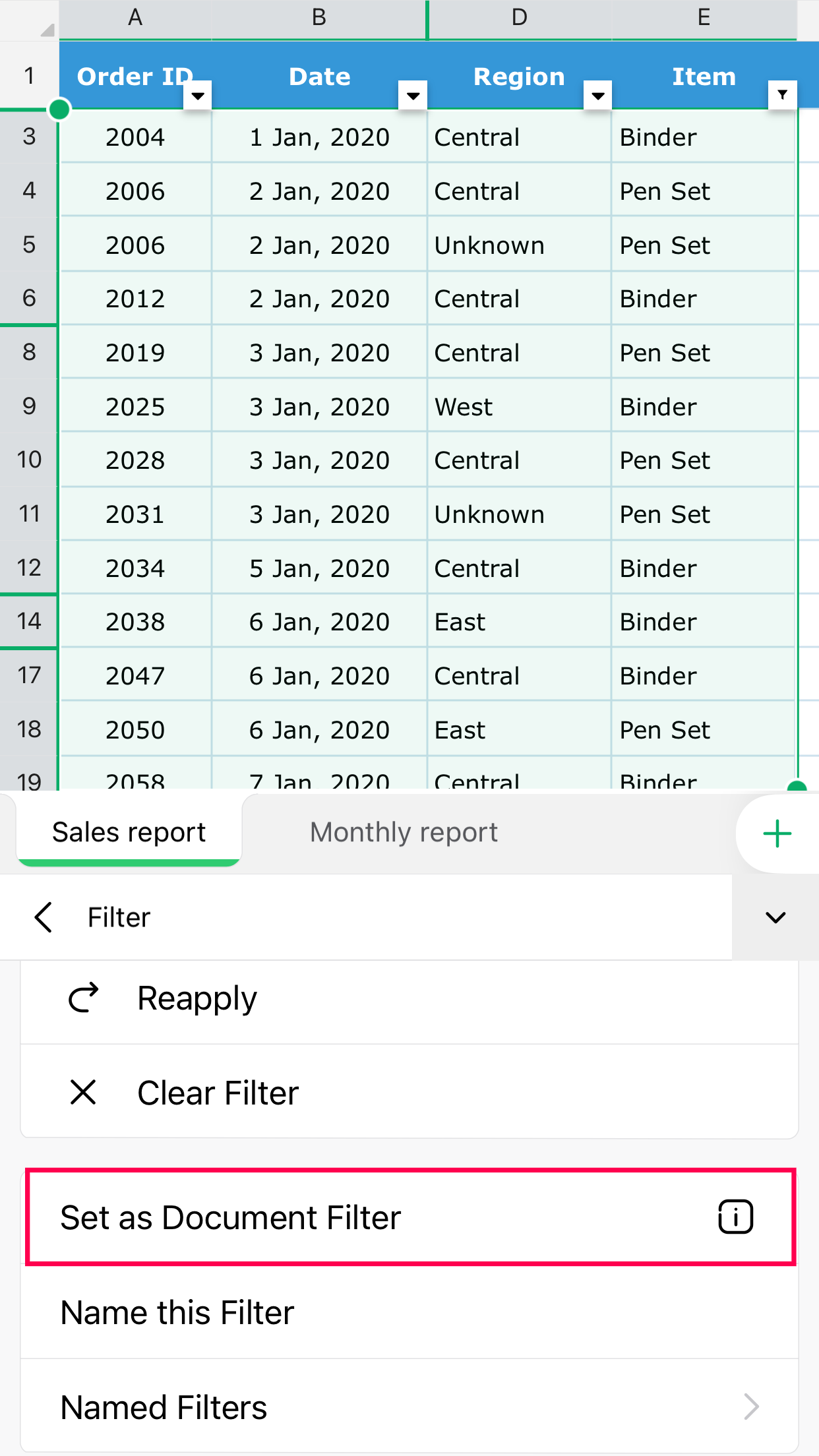 ドキュメントフィルターとしてフィルターを指定することは、選択されたフィルターが、それが排除されるか別のものに置き換えられるまで、初めてスプレッドシートにアクセスする全てのユーザーに適用されることを意味します。ドキュメントフィルターは公開されたファイルにも存在します。
