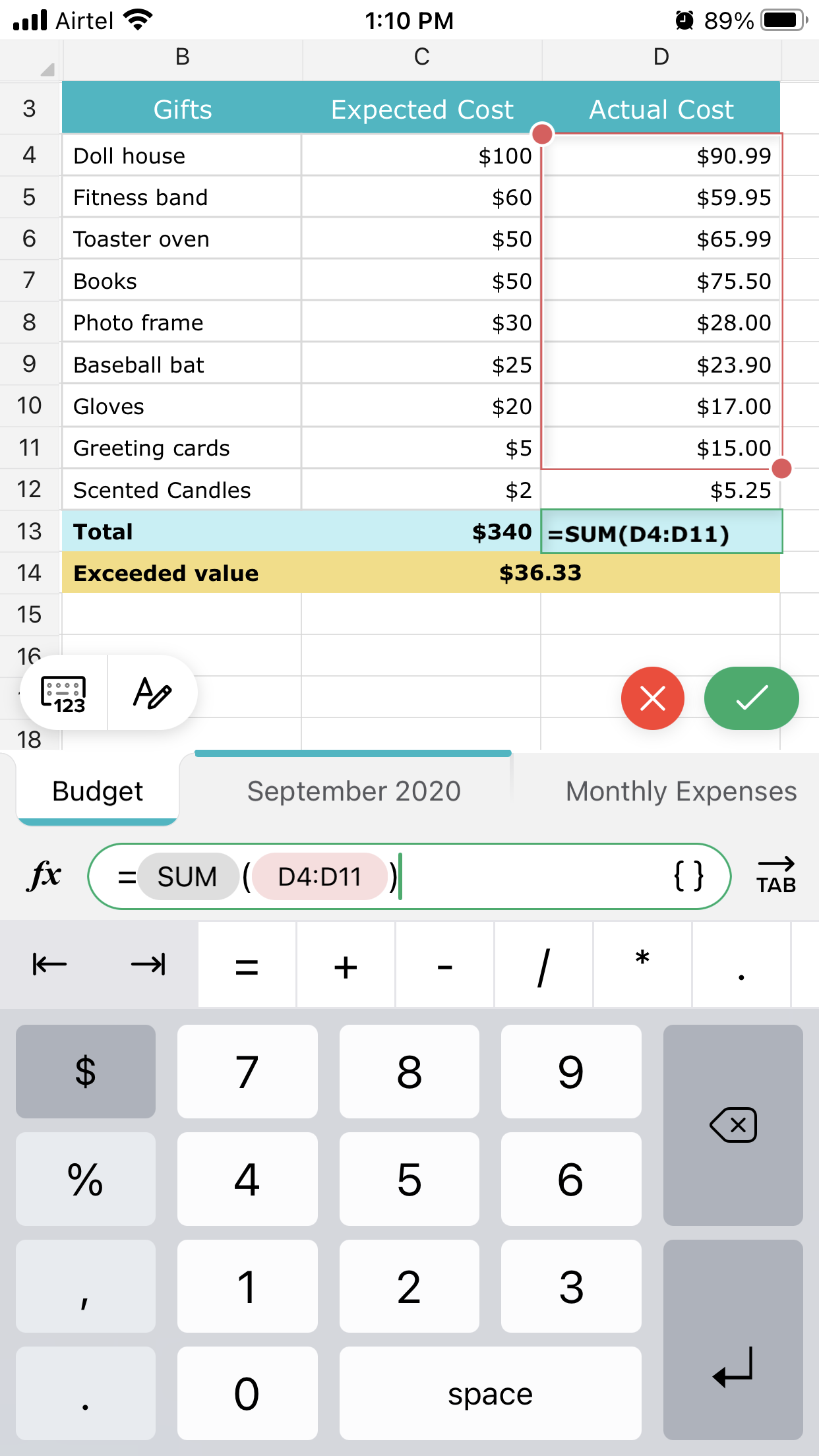3. 表示される関数の構文に値を入力するかセル範囲を選び、その後でをタップして結果を得ます。