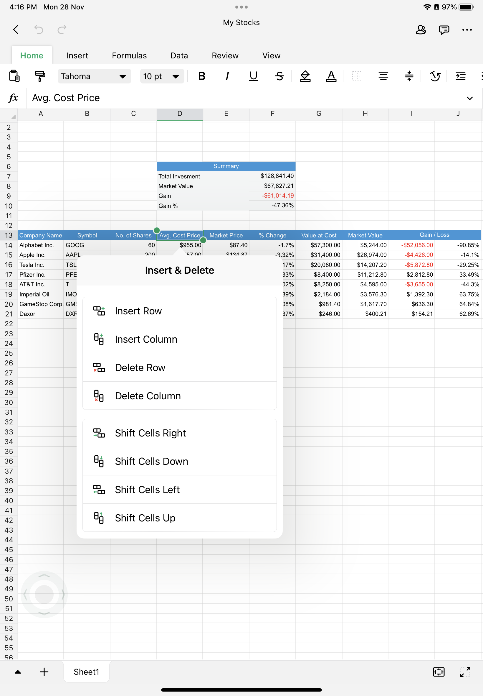 3. 提供されているオプションから、行や列を挿入または削除するか選択します。