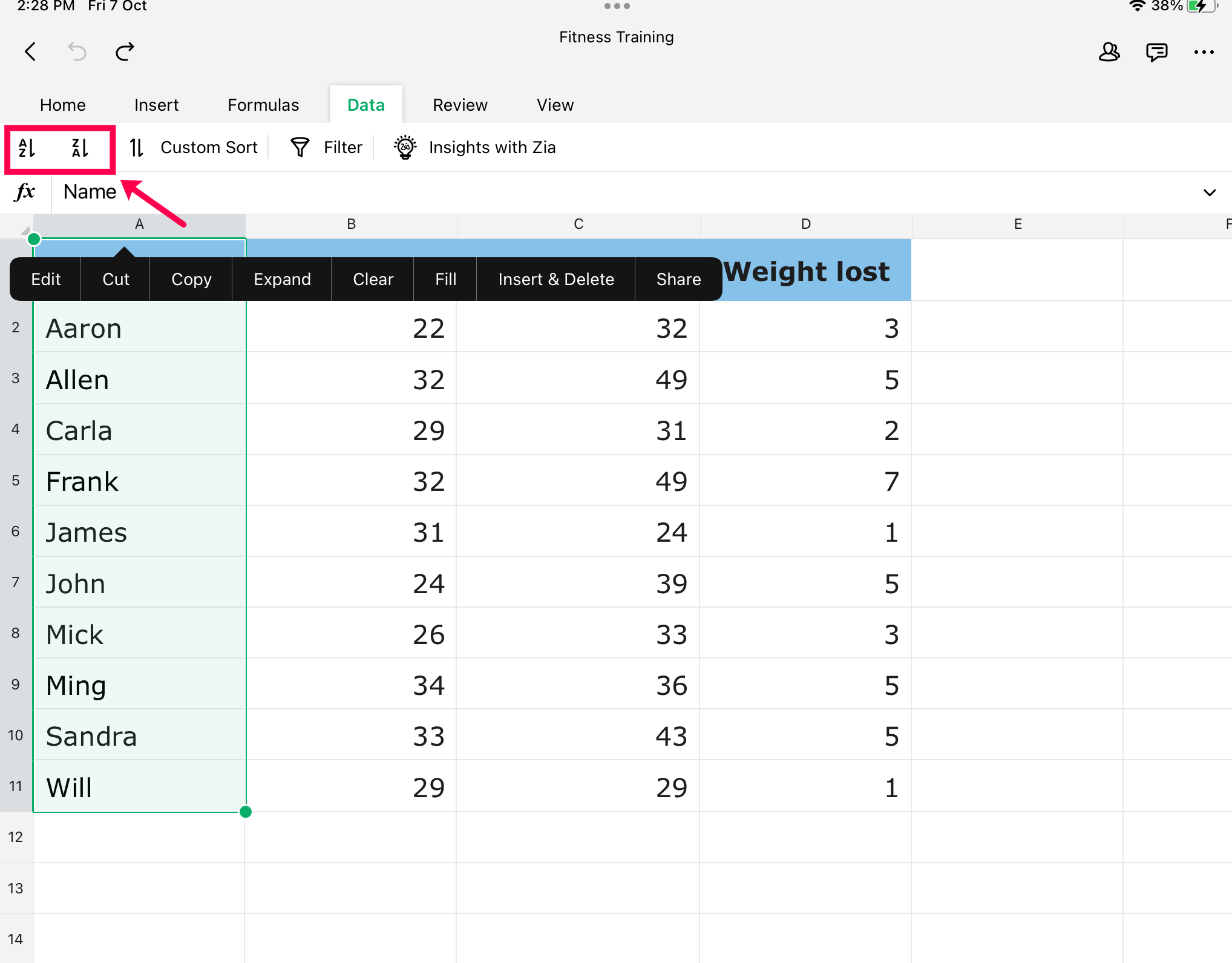 2. Data メニューの下で、昇順または降順にデータを整理したいに応じて、のいずれかをクリックします。