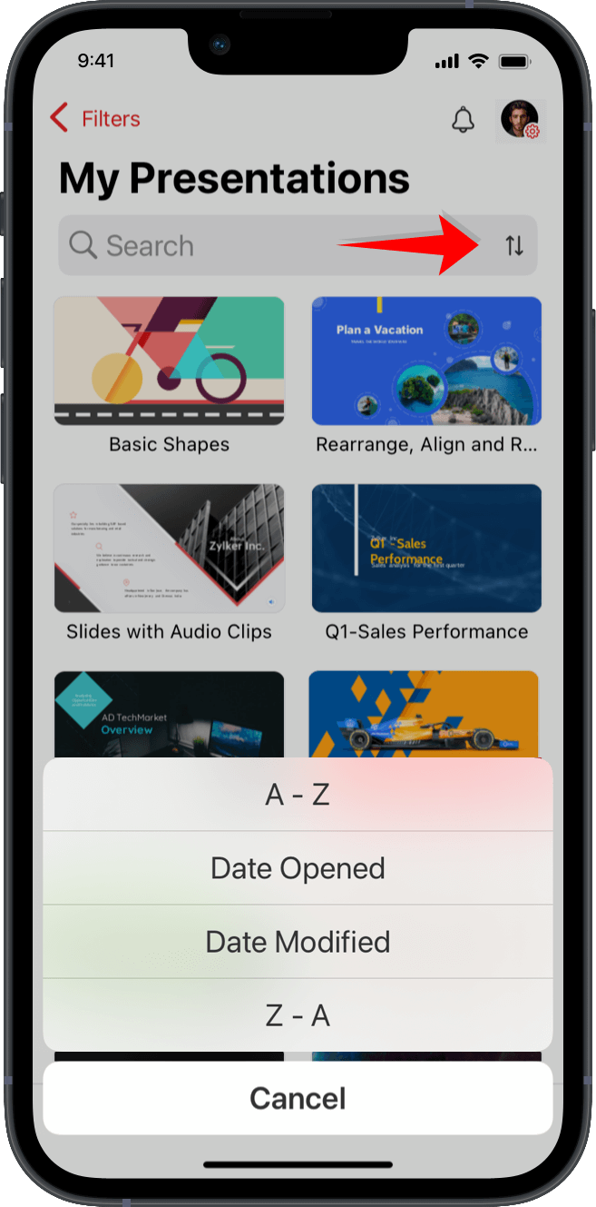 右上隅にある並べ替えるアイコンをクリックして、プレゼンテーションをアルファベット順、逆アルファベット順、または最近開いた日付または更新した日付に基づいて並べ替えます。