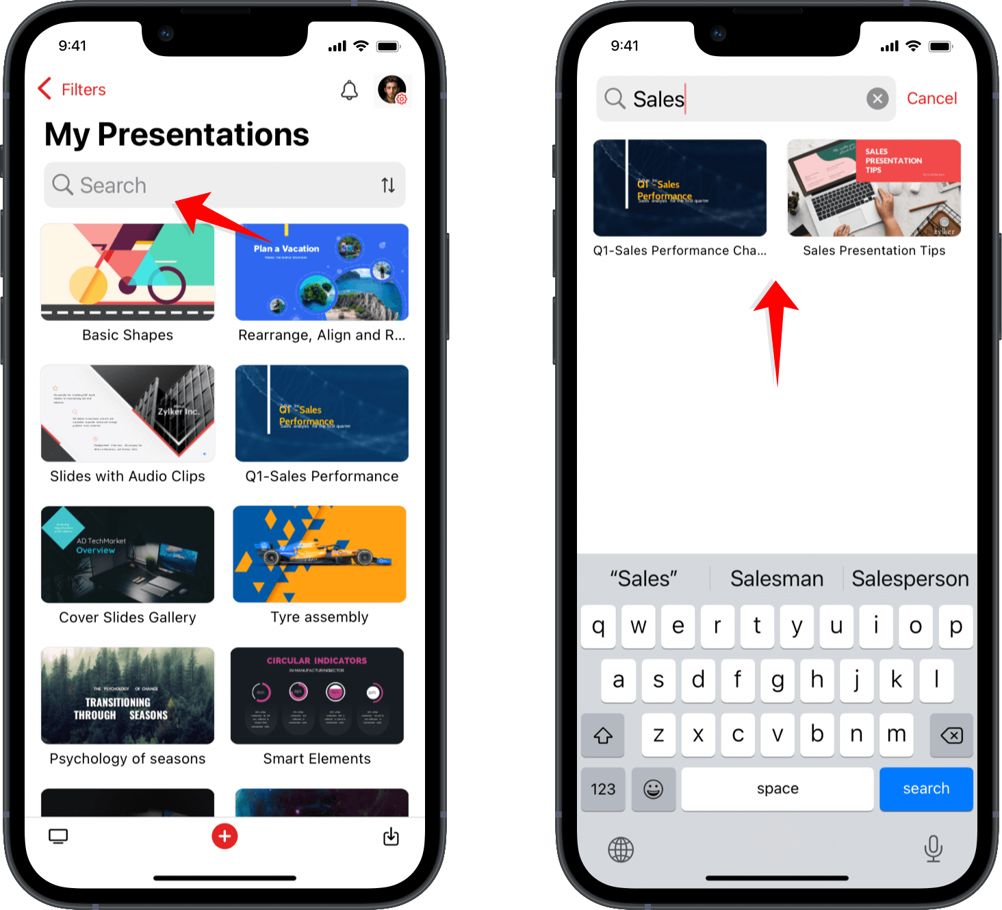 表示アプリを使用すると、検索するか並べ替える機能を使用して、目的のプレゼンテーション(一覧内)を素早く見つけることができます。
