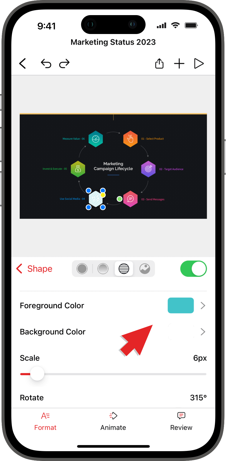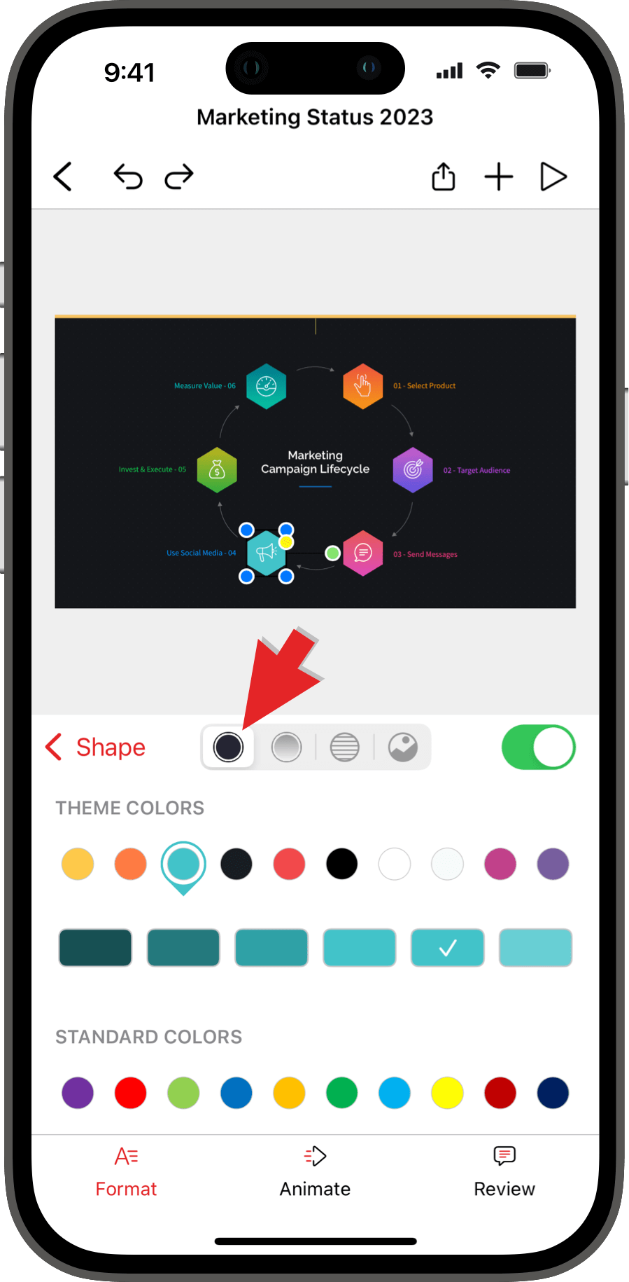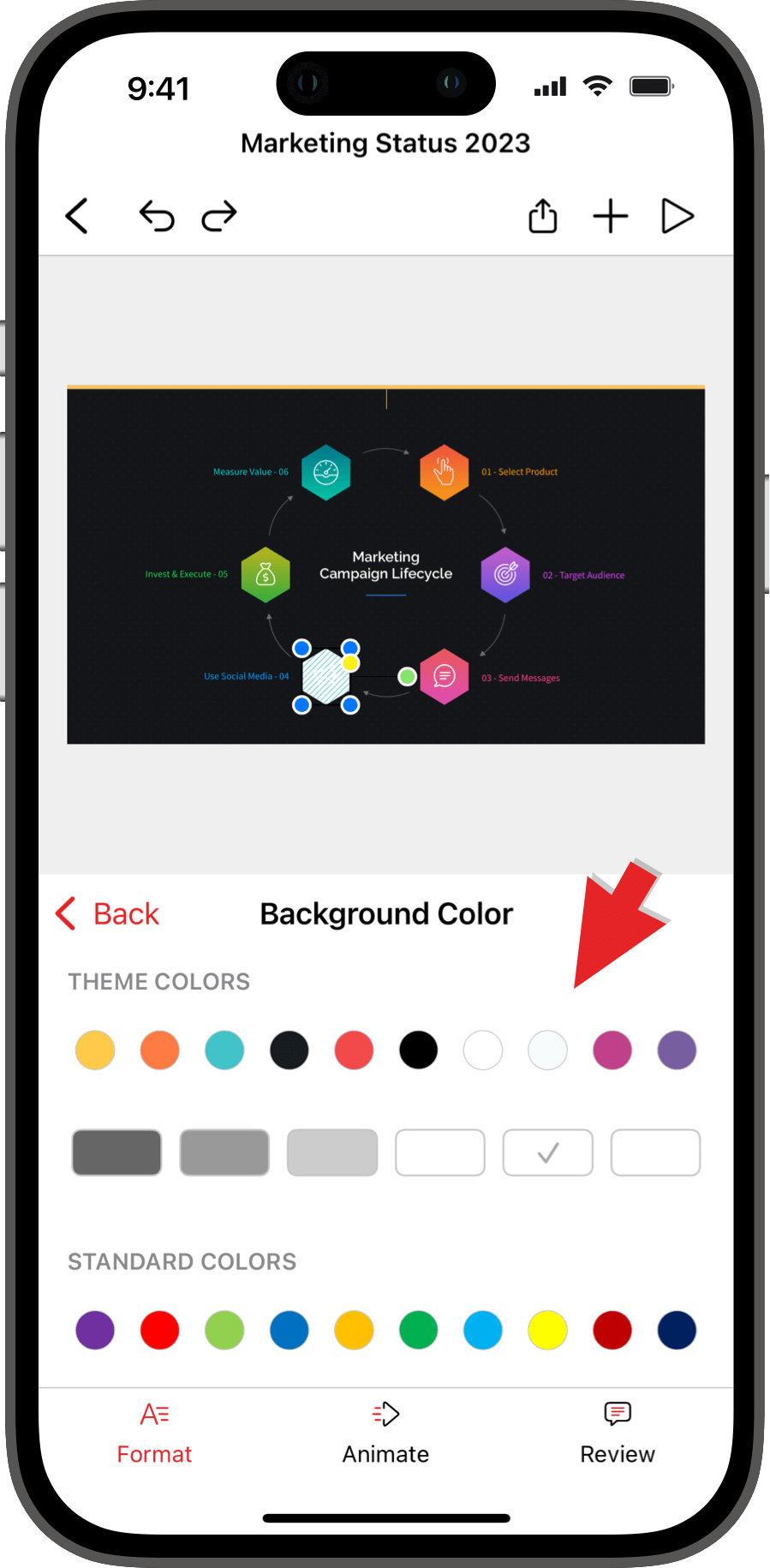 1. Background Colorをタップして、Theme Colors またはスタンダード Colorsから色を選択します。
