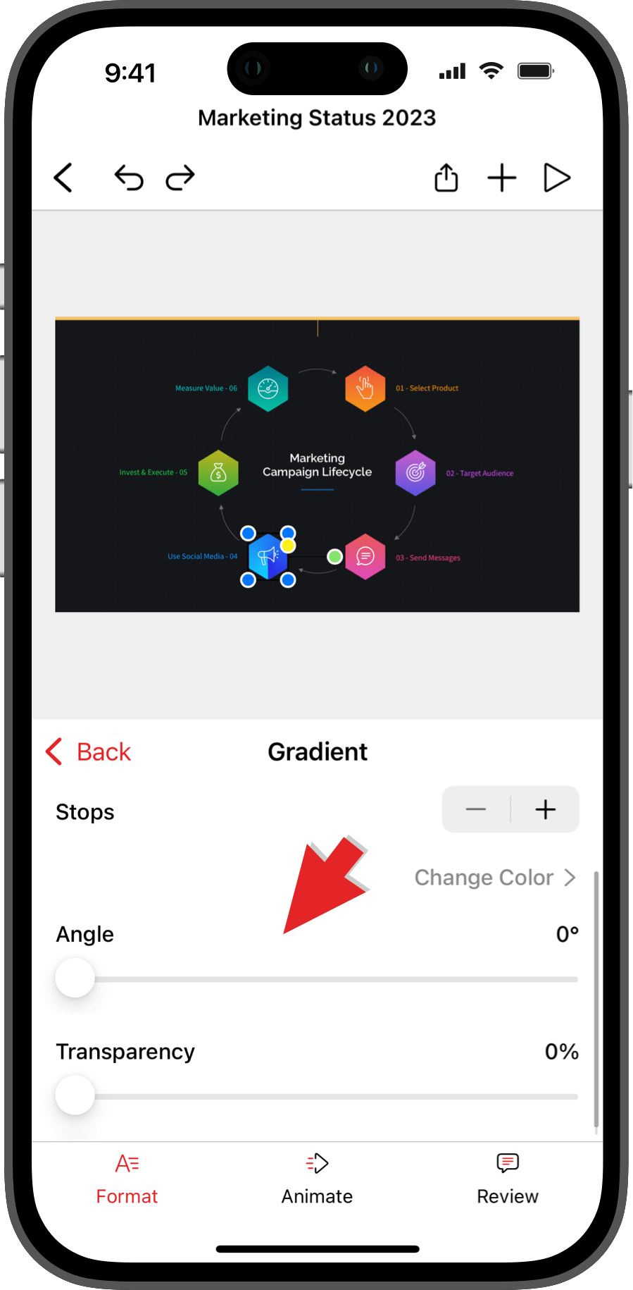 3. グラデーションがどの方向から始まるべきかを決定するために、Angle sliderをスライドします。