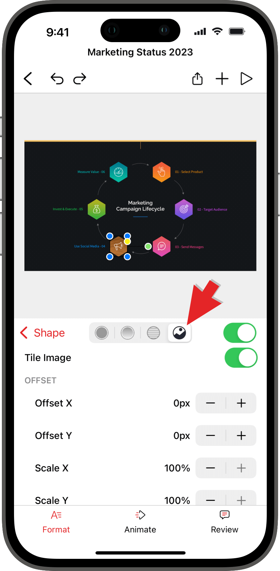 1. スライド内のタイルテクスチャの開始点を移動するには、オフセットとスケールを使用します。