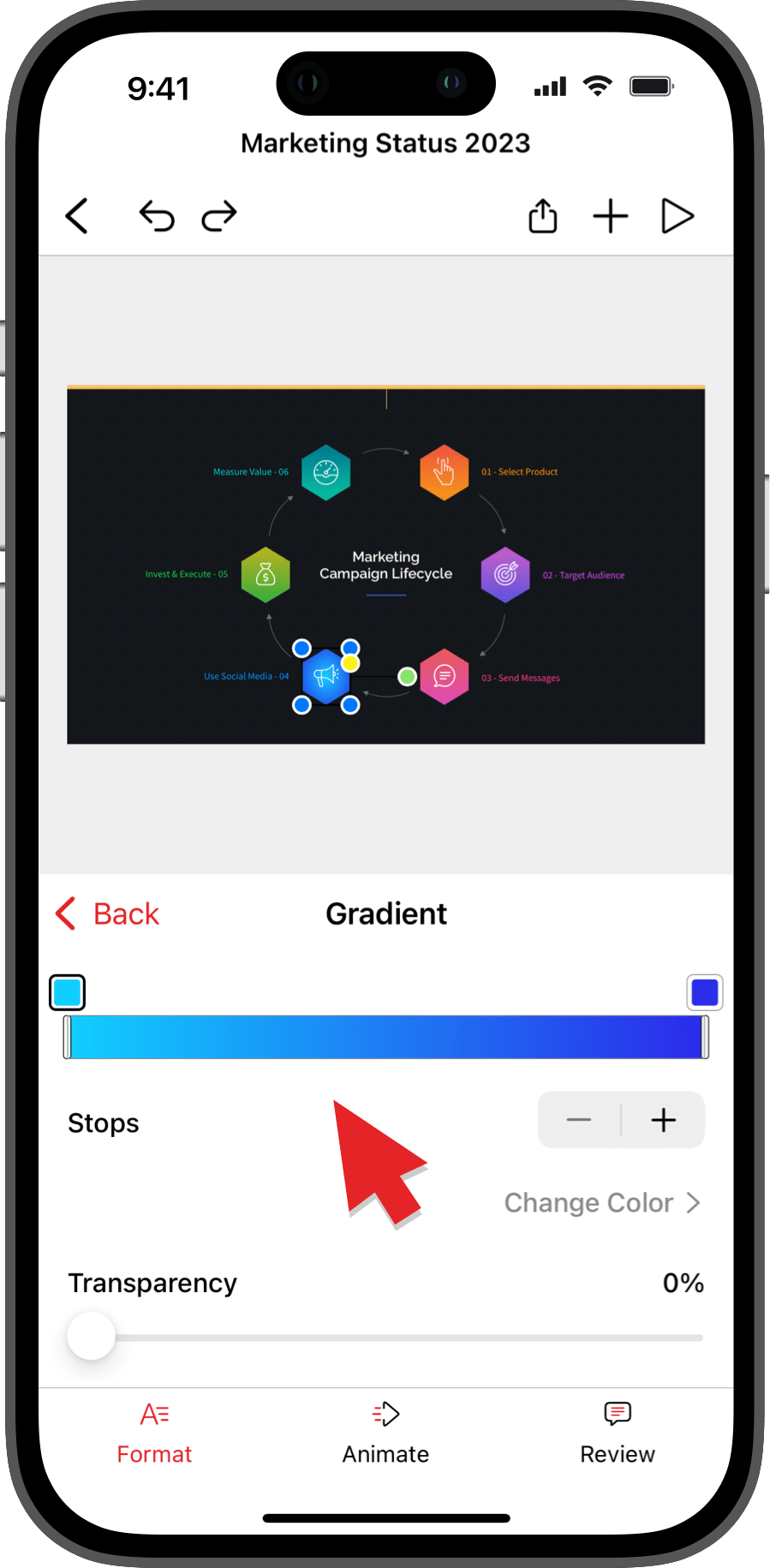 1. Stopsの次にある+と-をタップして、グラディエントストップを追加および削除します。