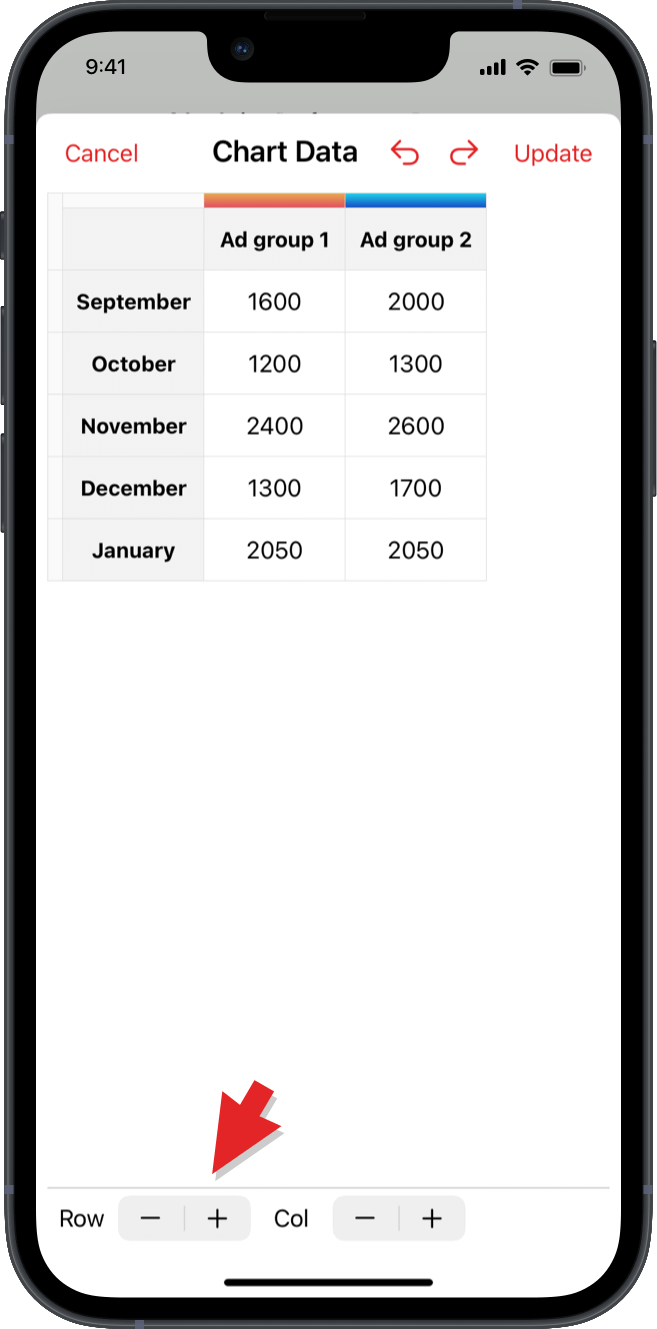 スクリーンの下部にある 行 と 列の隣にある + と - ボタンを押して、行と列を追加するか削除します。