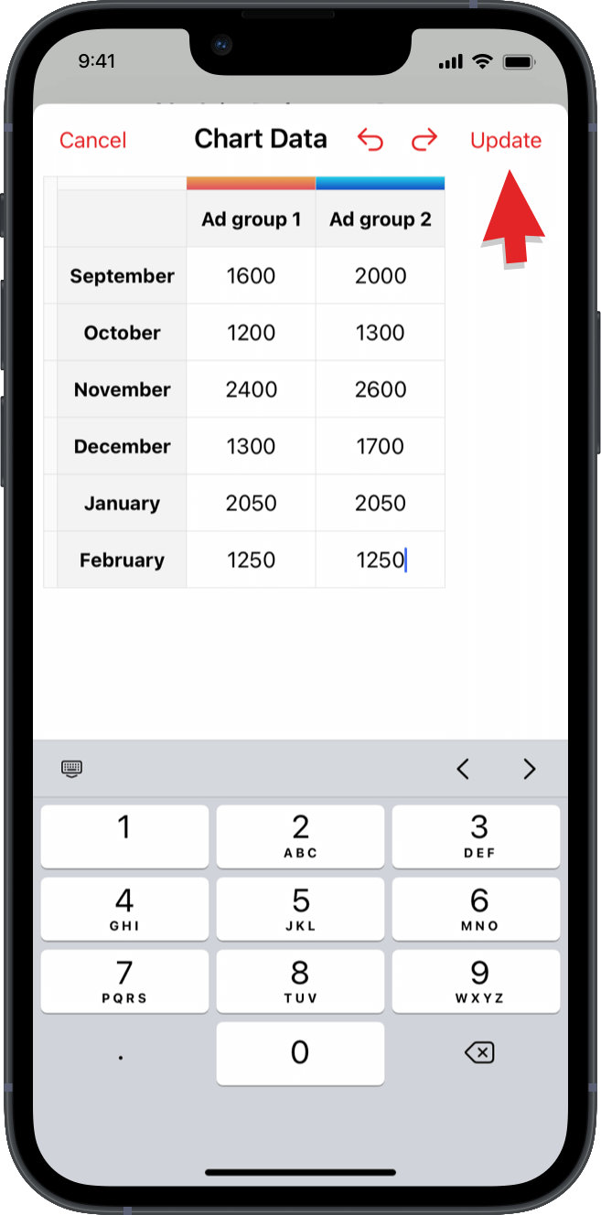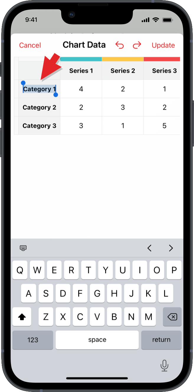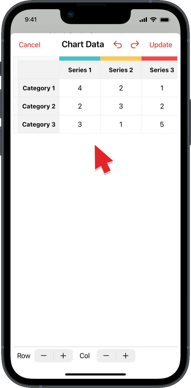 チャートを選択すると、Chart Data table が表示されます。行と列をクリックしてデータを入力します。