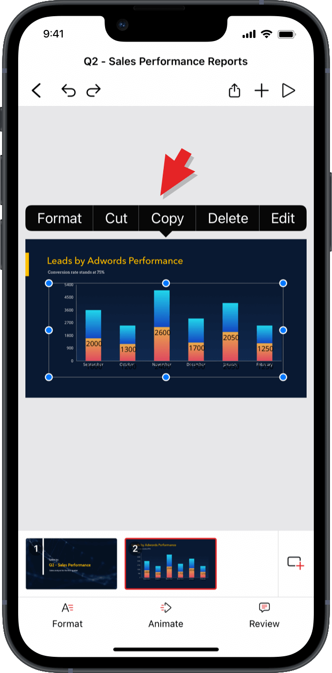 望ましいスライドを開き、上部右端に位置する アイコンをクリックします。