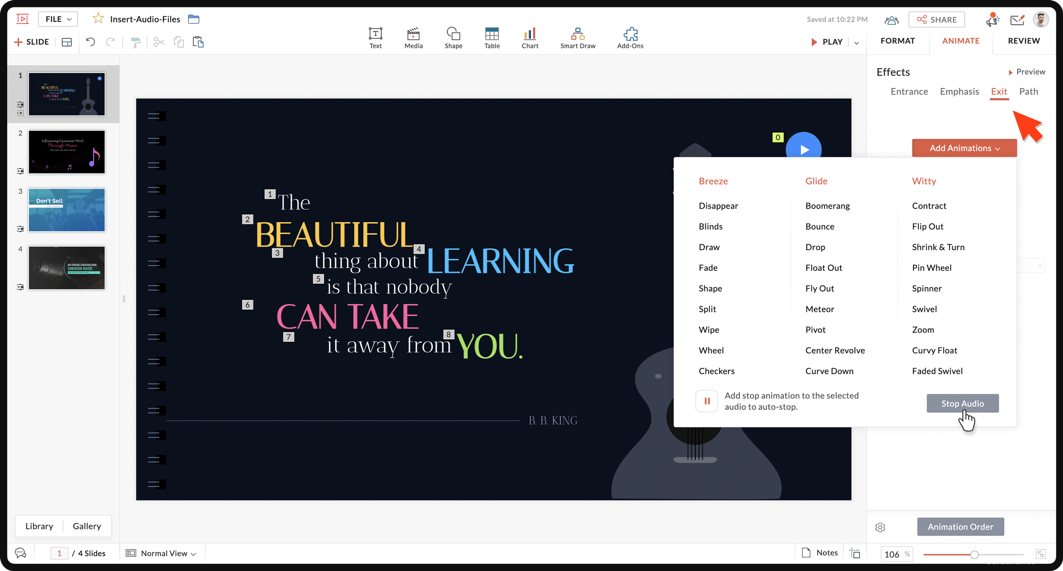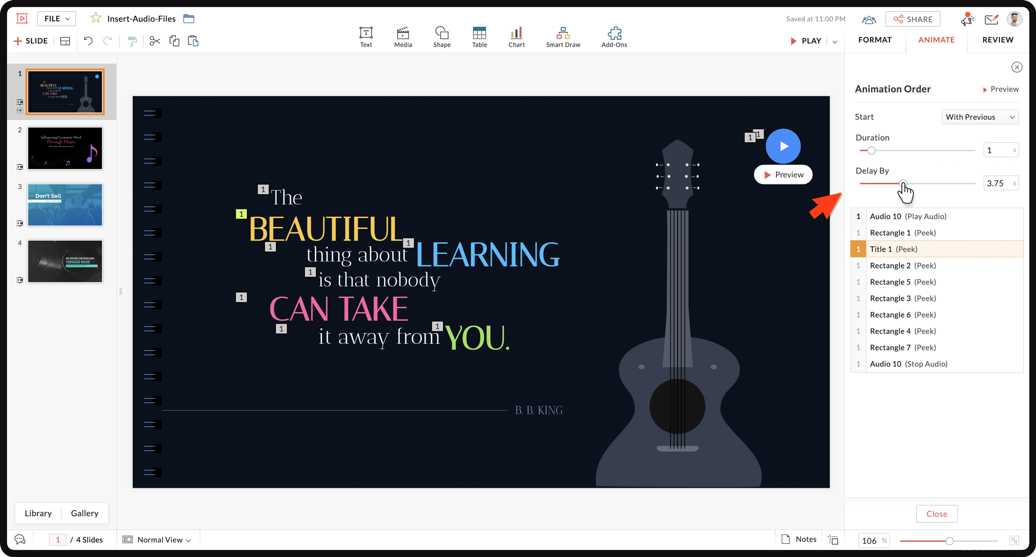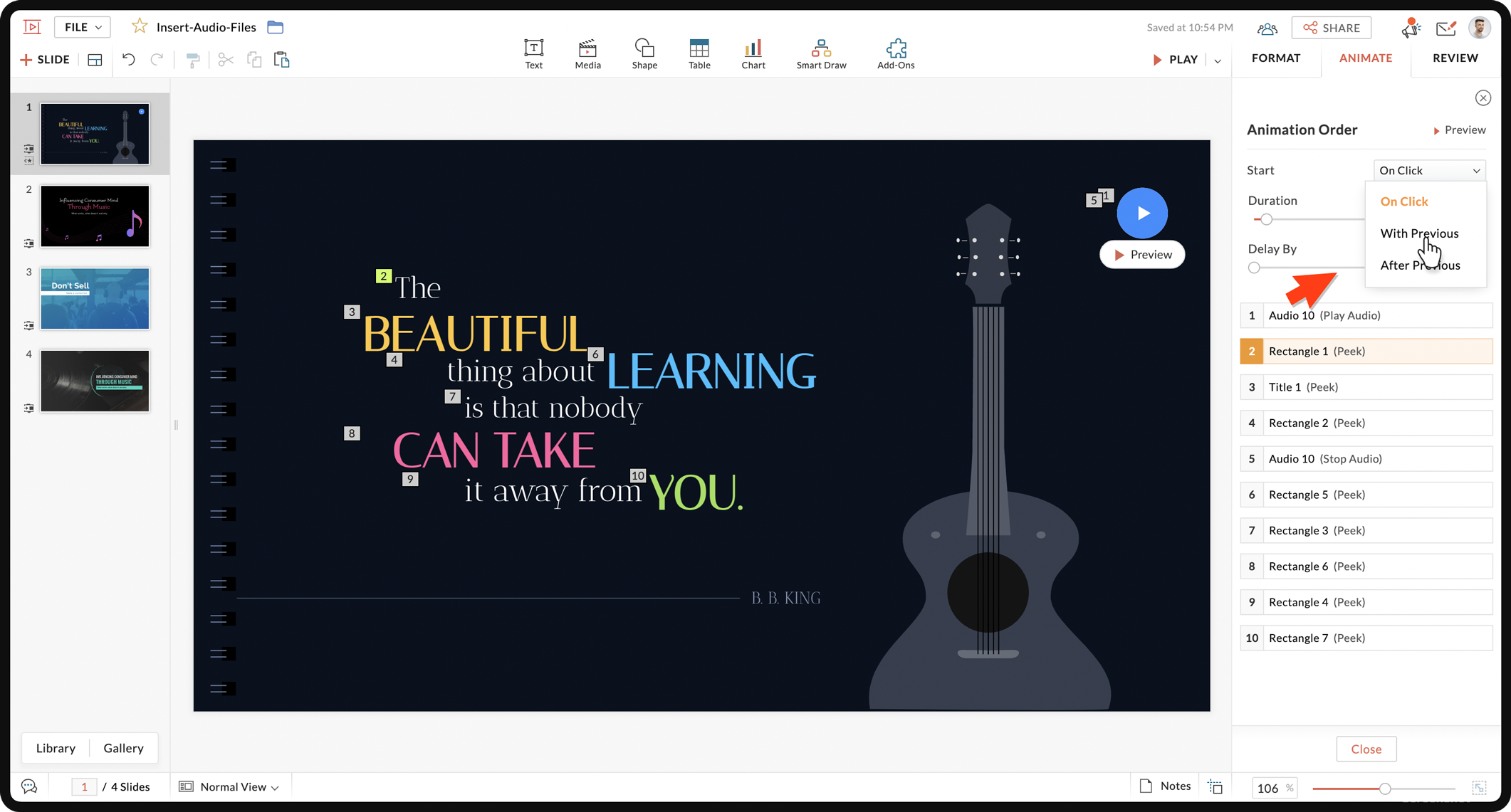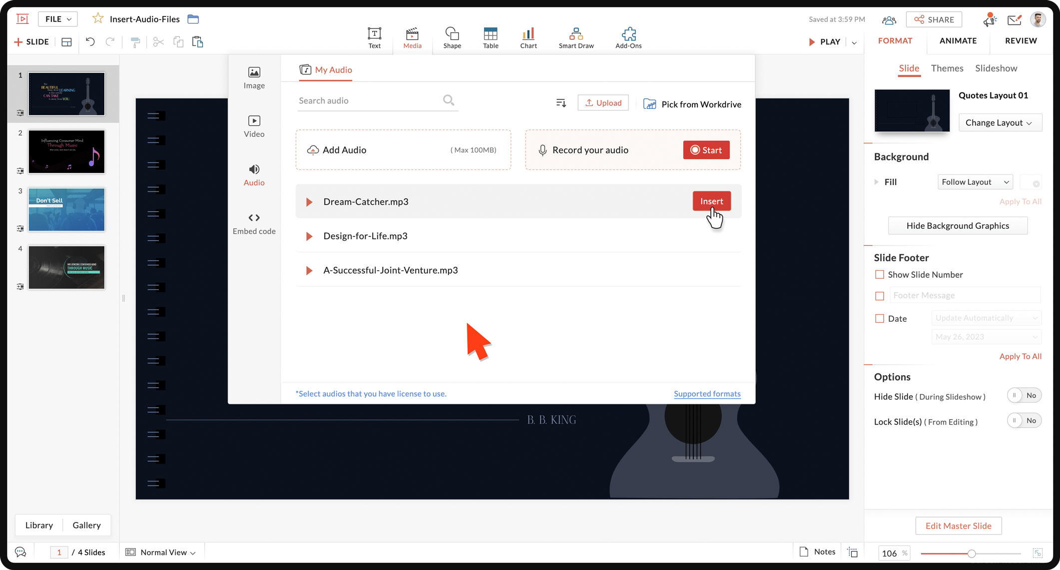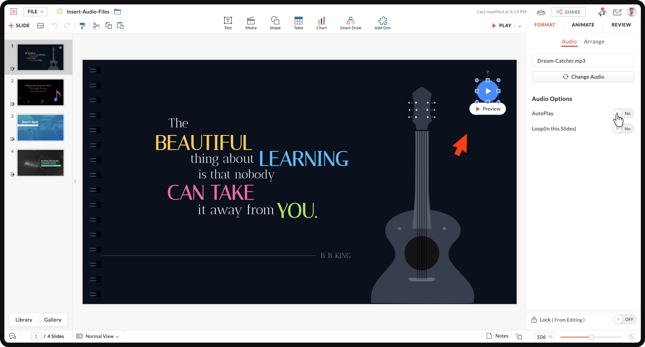 1. スライドに追加したいオーディオを選択し、Media タブから追加します。