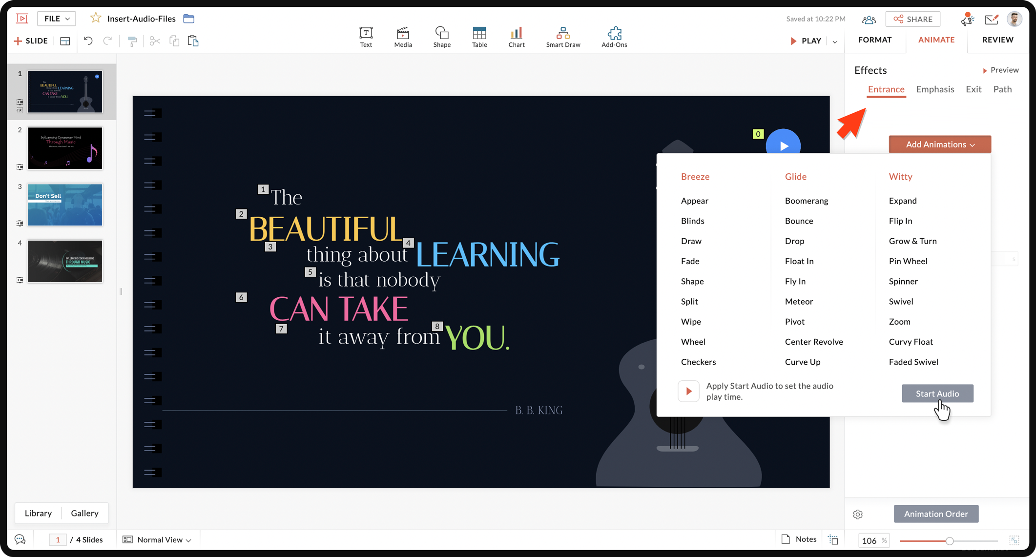 3. EntranceEffects の下から選択し、オーディオ再生用に 開始するをクリックします。