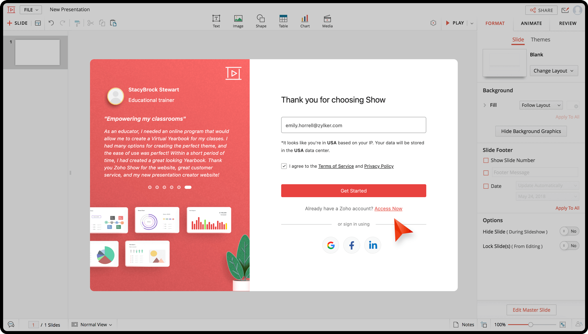 Zoho Showを利用すれば、作成、編集、共有、公開、全世界からスライドを配信することができます。マーケティング、営業、または他の企業のプレゼンテーションをオンラインで開始するために必要なのはメールアドレスだけです。認証情報を設定したら、それらを使用してZoho Showアプリを使用して、モバイル(iOSおよびAndroid)およびテレビ(AppleおよびAndroid)のデバイスからスライドをアクセスして配信することができます。