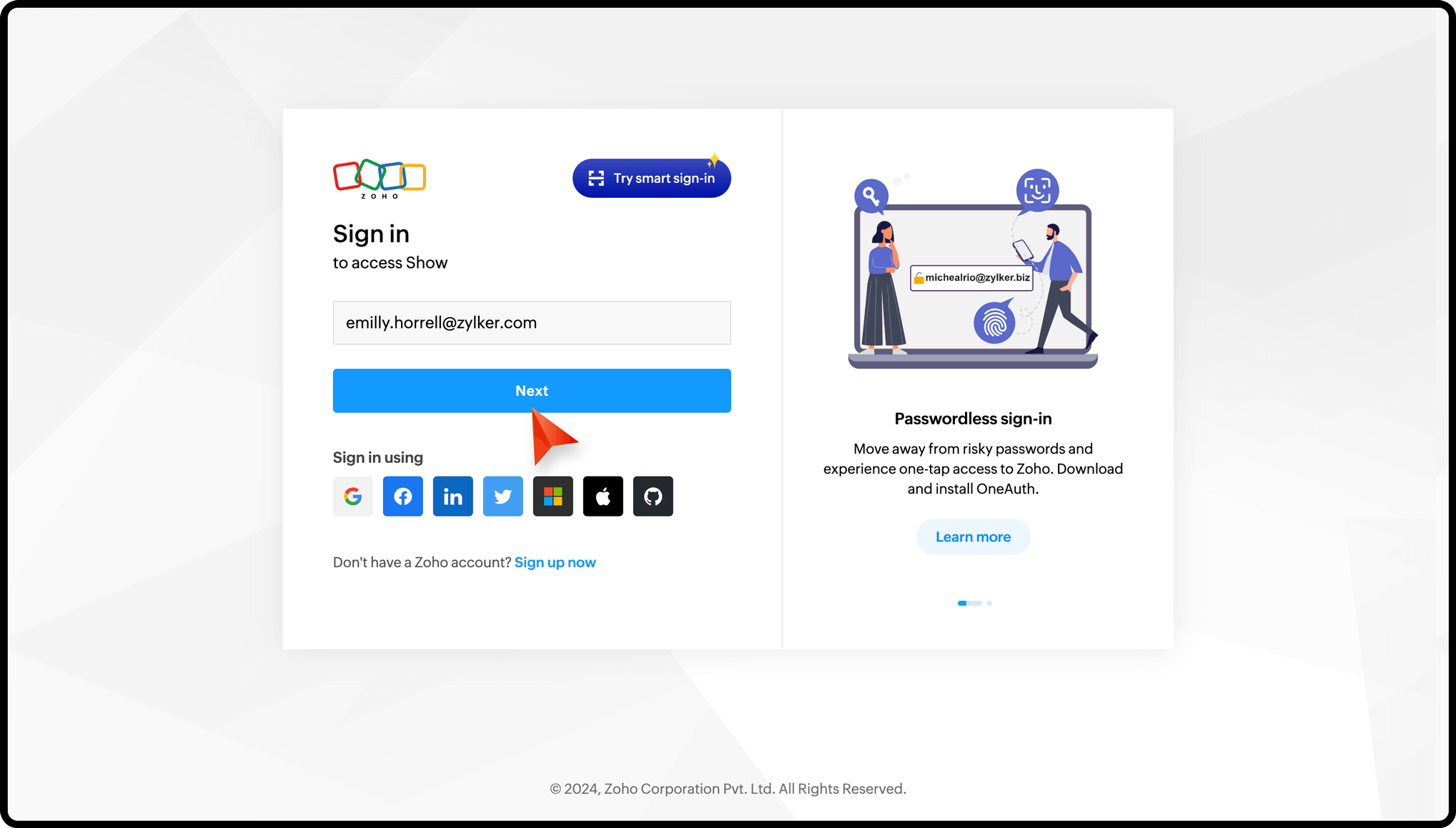 2. メールアドレスを提供し、開始をクリックしてZohoアカウントを設定します。または、Google、Facebook、またはLinkedInアカウントを使用してアプリケーションにサインインすることもできます。