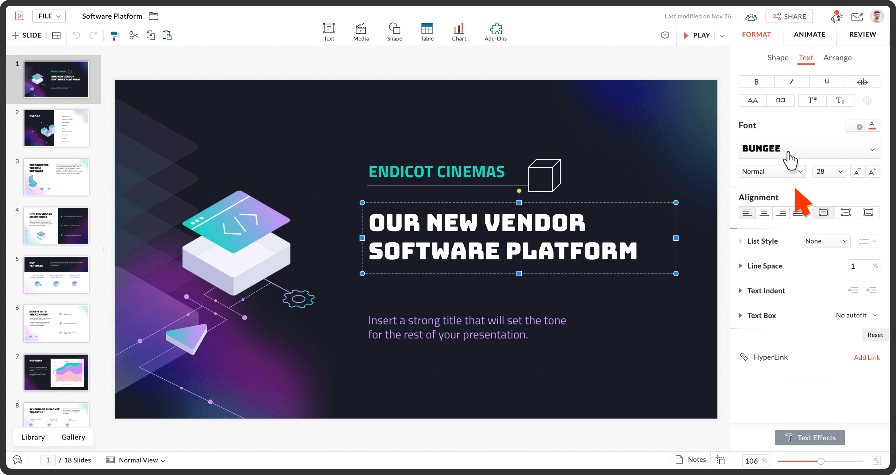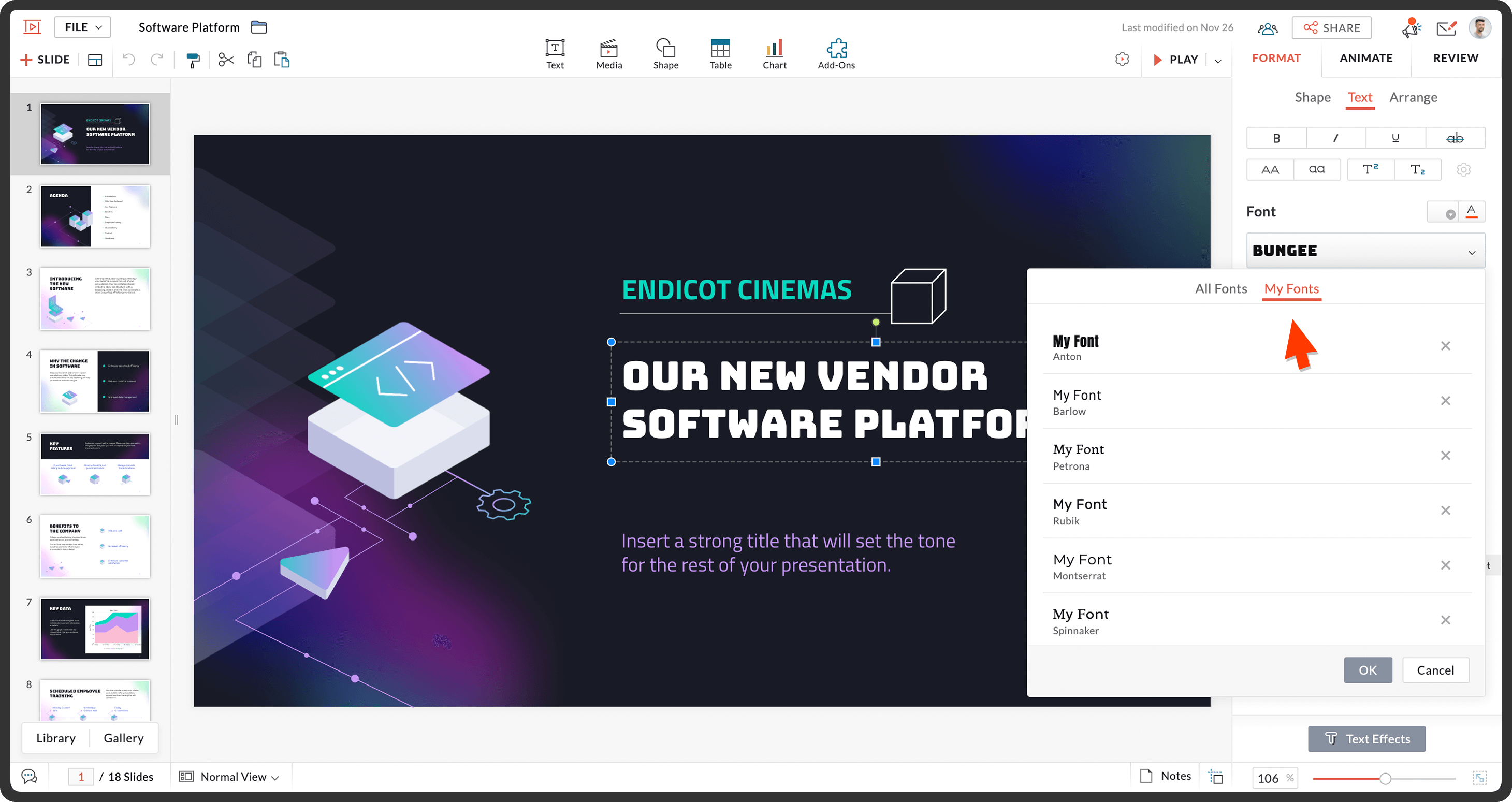 ギャラリーへフォントが追加されると、テキストを選択し、希望のフォントをクリックして選択したテキストに適用します。