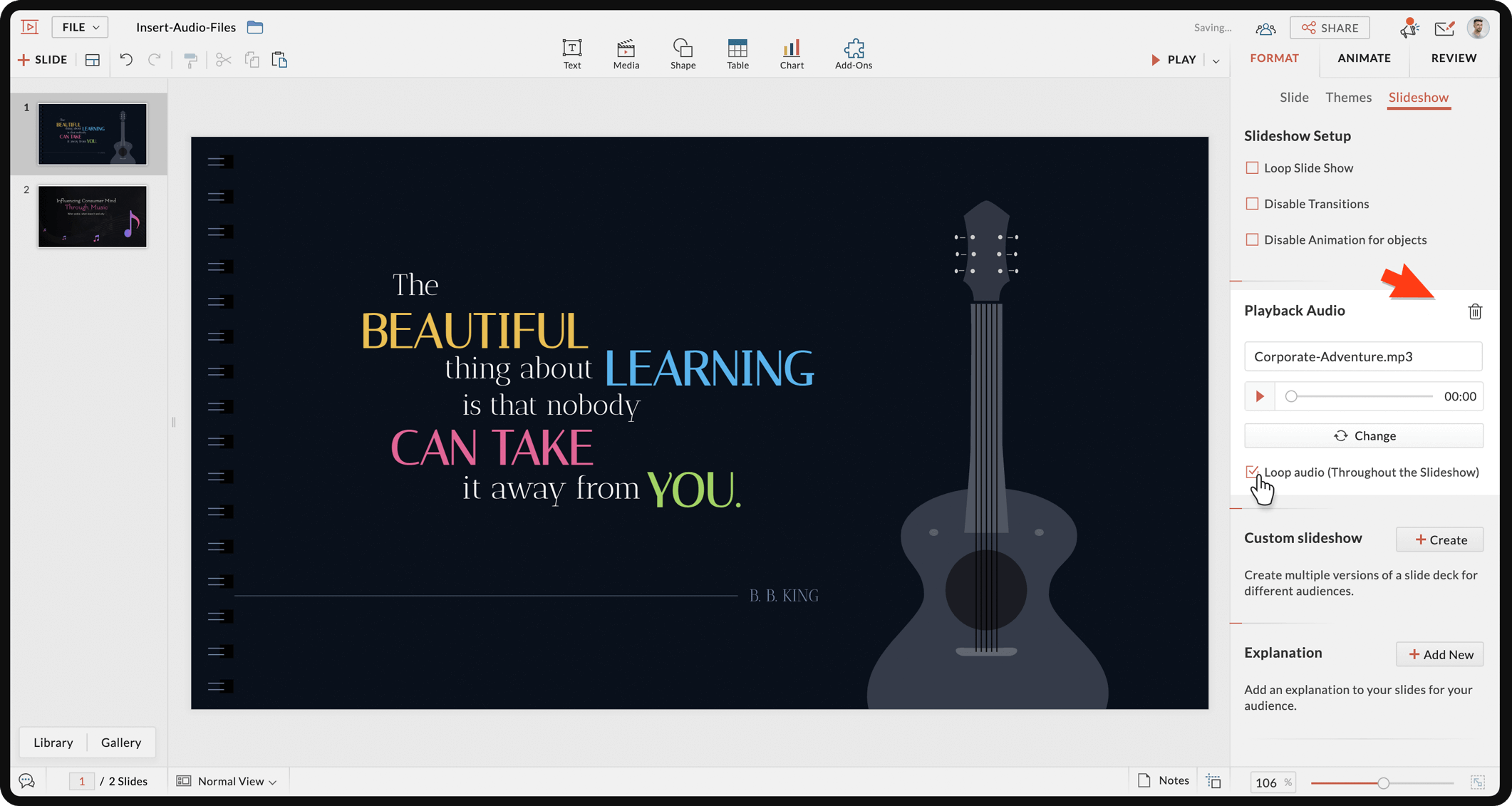 8. プレゼンテーション全体でオーディオを連続して再生させたい場合は、Loop Audio箱にチェックを入れます。これは、オーディオファイルが短く、何度も連続再生させたい場合に特に便利です。