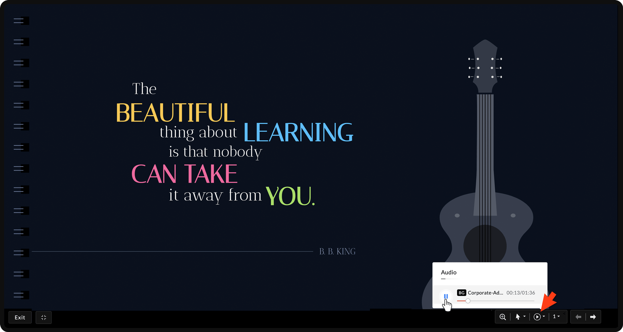 初期設定では、バックグラウンドオーディオはスライドショー開始時に再生が始まります。オーディオを一時停止と再開させるには、スライドショーの右下角にある再生アイコンを使用します。