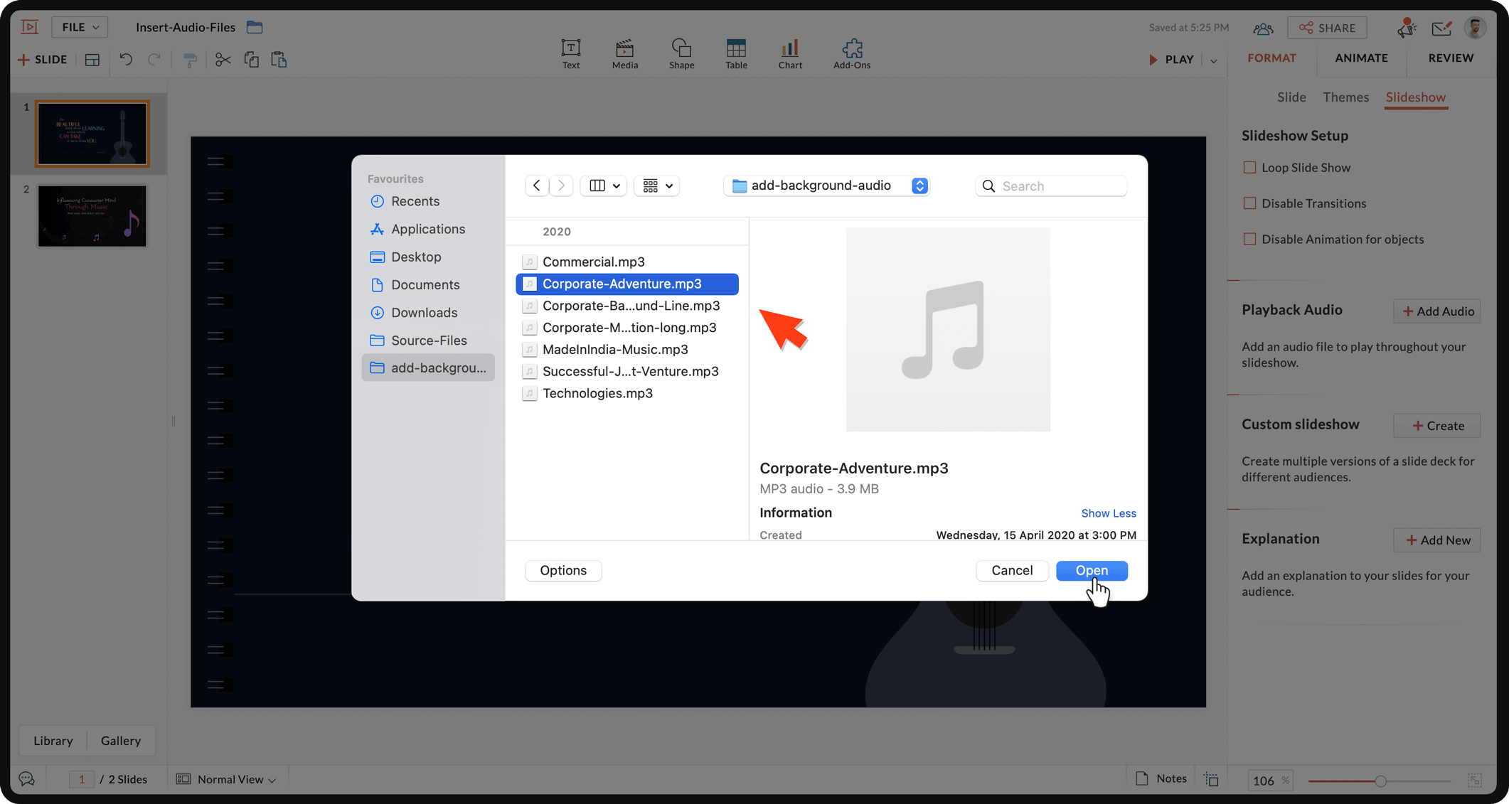 3. ご使用のデバイスから任意のオーディオファイルを選択し、開くをクリックしてスライドに挿入します。