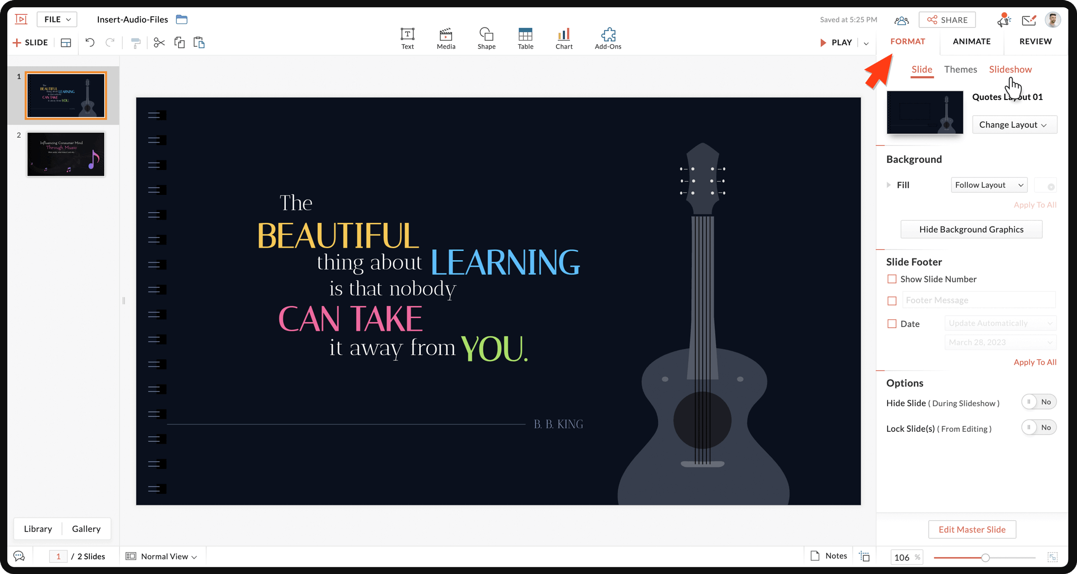 1. まず、スライドを選択し、右ペインにある形式をクリックし、その後スライドショーを選択します。