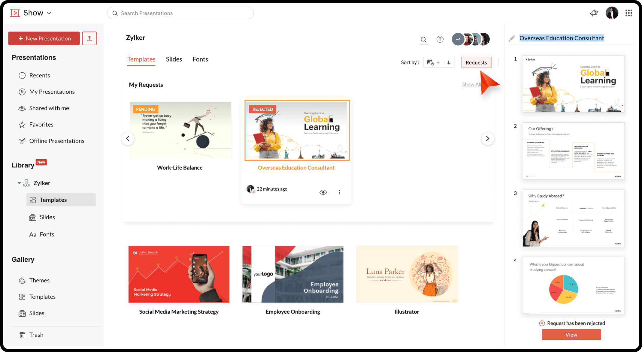 テンプレート、スライド、またはフォントを選択して、各カテゴリ内の保留中のリクエストのリストを表示します。