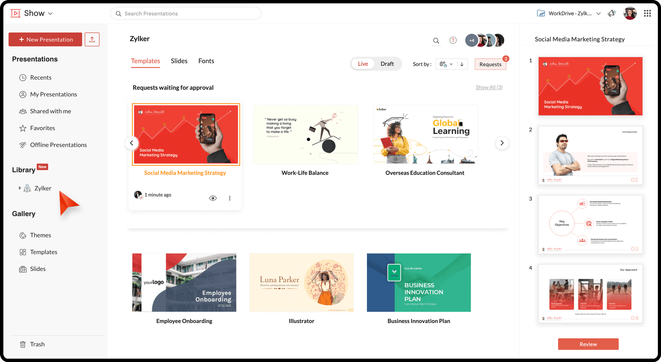 メンバーがプレゼンテーション テンプレートまたはスライドを編集すると、編集バージョンは下書きタブにあります。管理者とスーパー管理者は、これらを承認し、メンバーがアクセス可能な状態にすることができます。