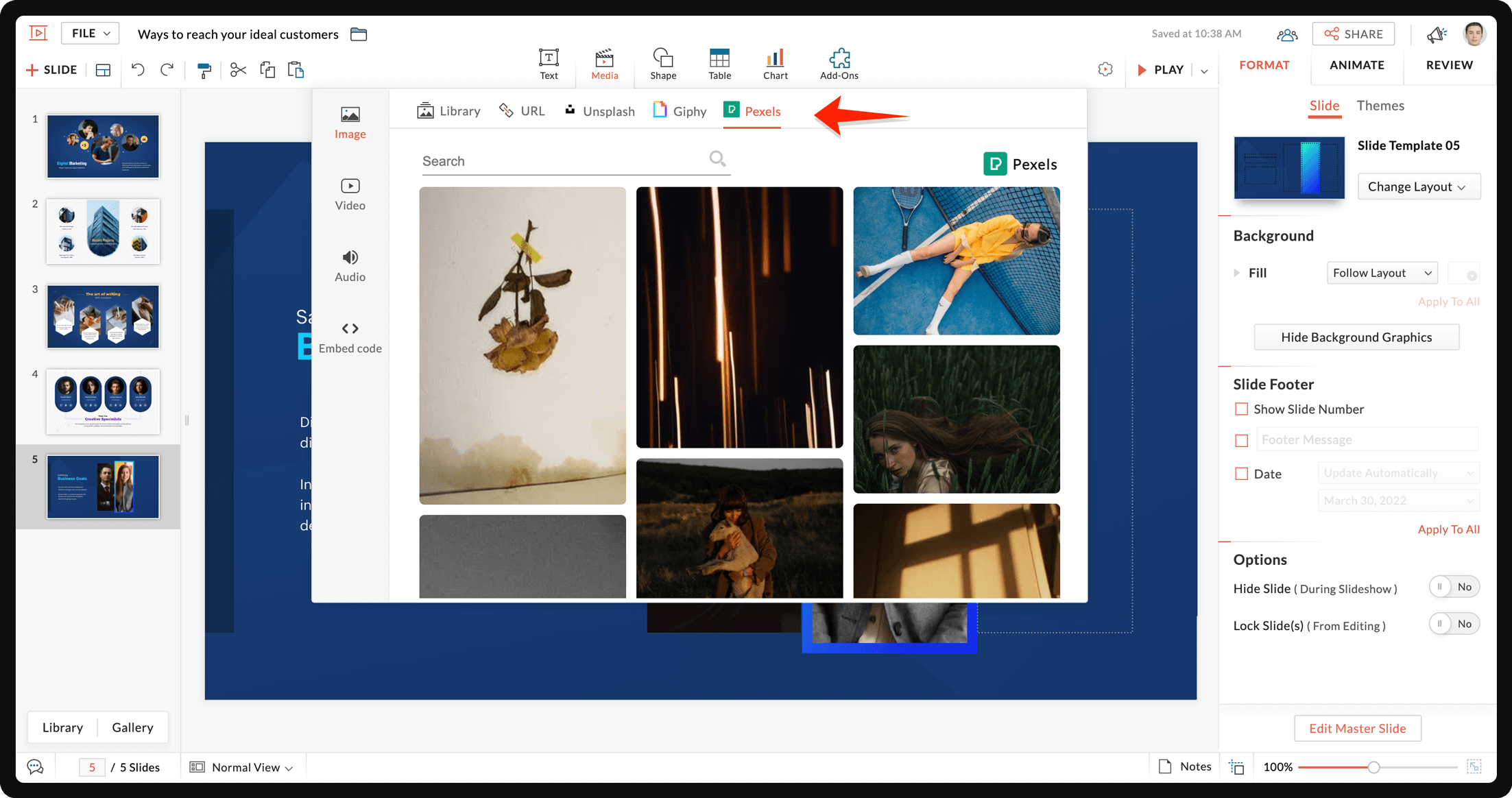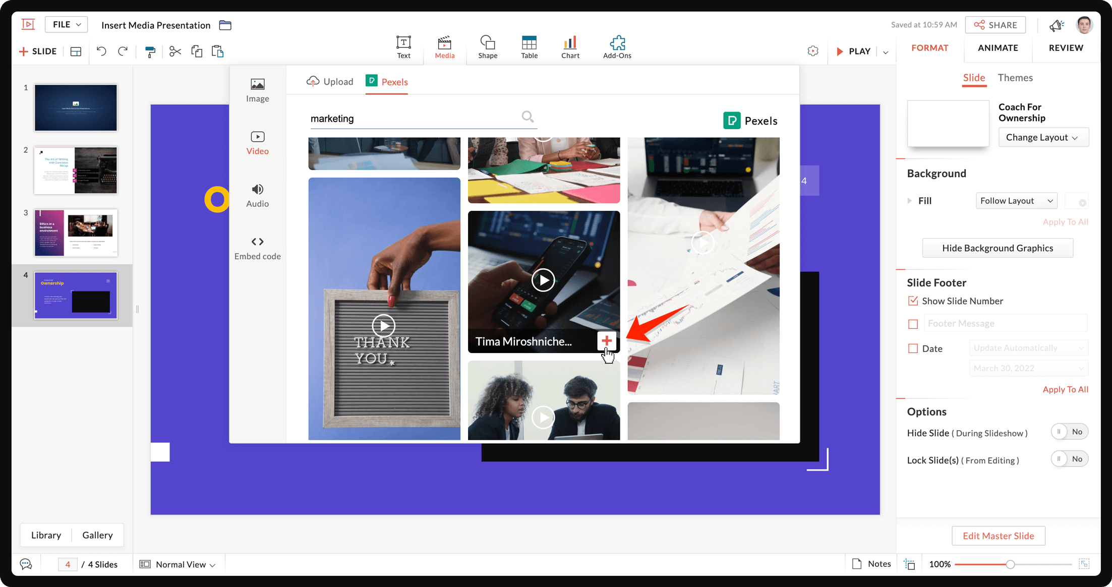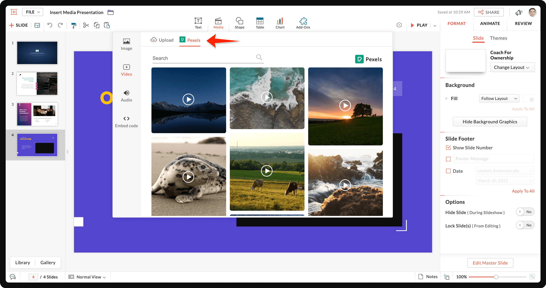 Zoho ShowはPexelsと提携して、関連する画像や動画を探して、スライドに組み込む手助けをします。Pexels 追加する-オンを使用して、表示で視覚的に魅力的なプレゼンテーションを作成できます。