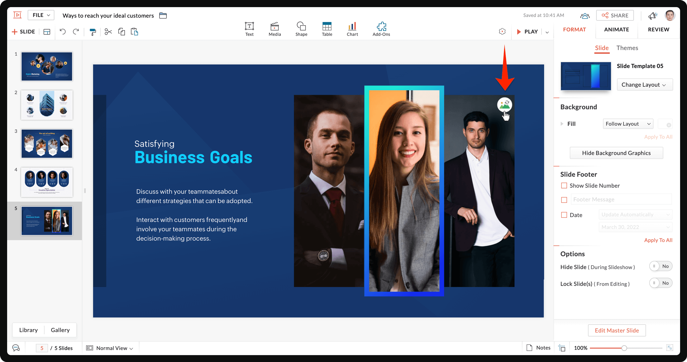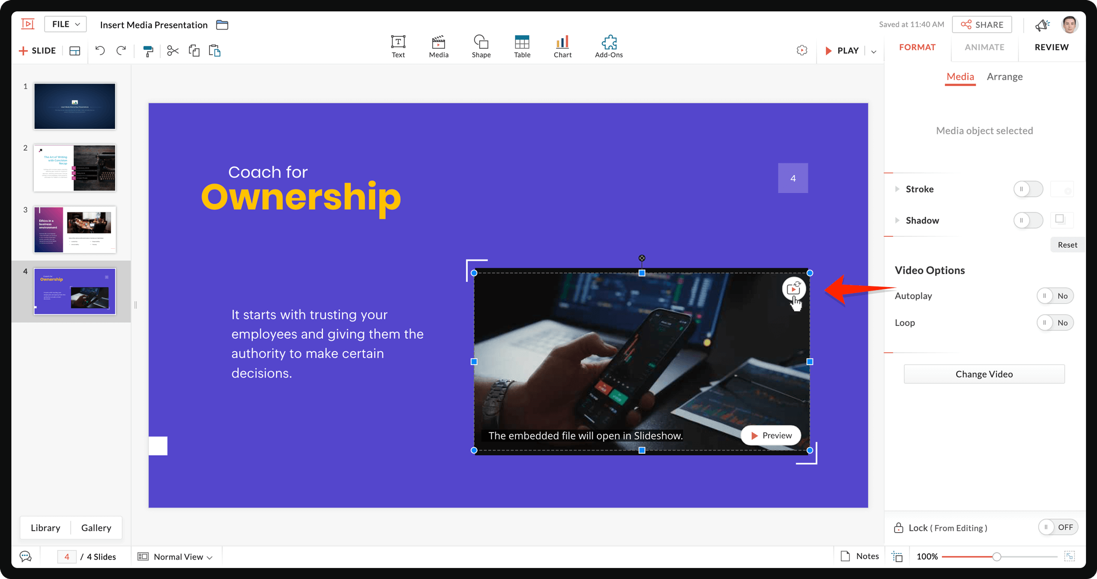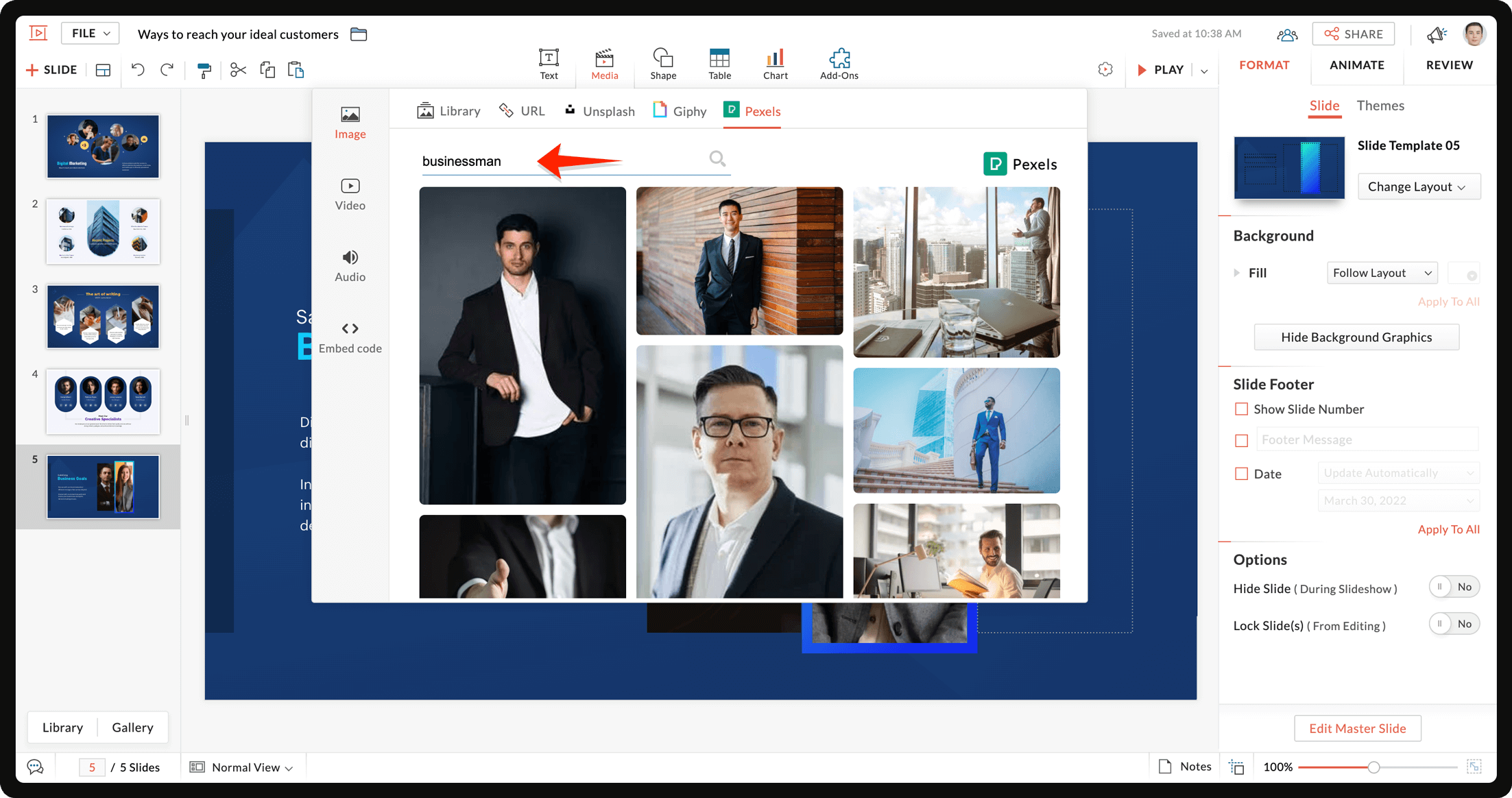 Zoho ShowはPexelsと提携して、関連する画像や動画を探して、スライドに組み込む手助けをします。Pexels 追加する-オンを使用して、表示で視覚的に魅力的なプレゼンテーションを作成できます。