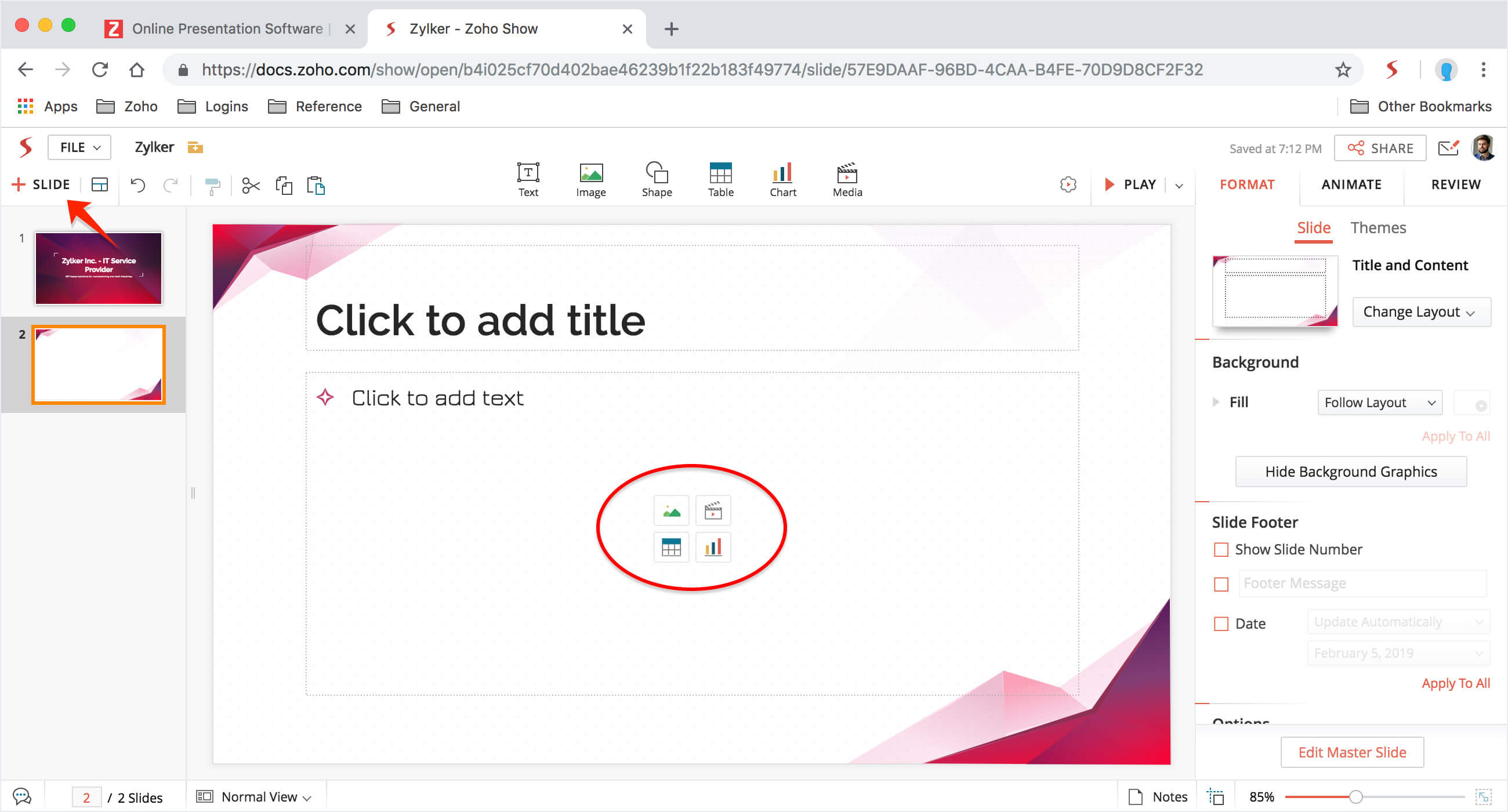 4. 左上隅にある+ スライドボタンをクリックして新しいスライドの追加を開始します。