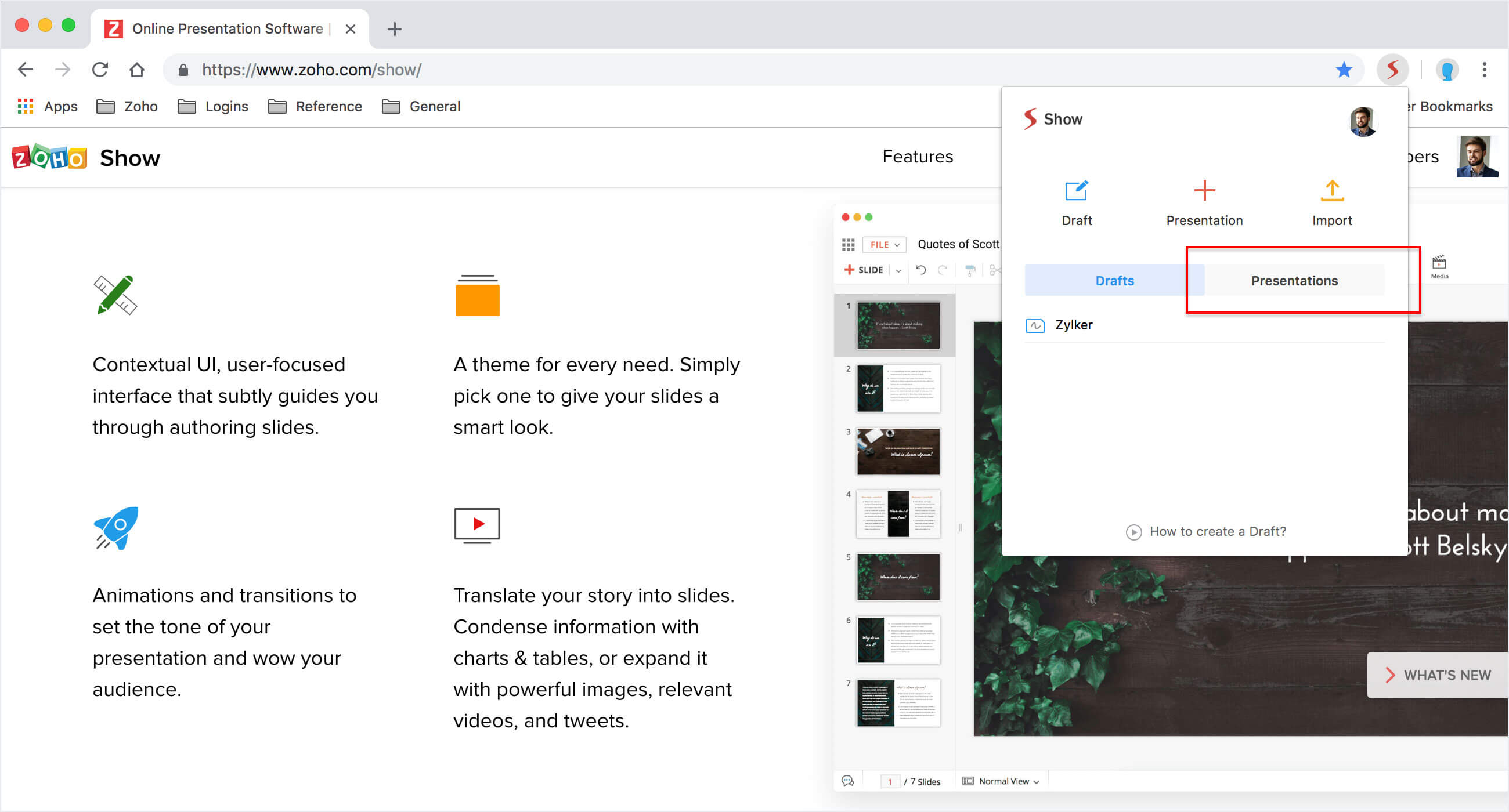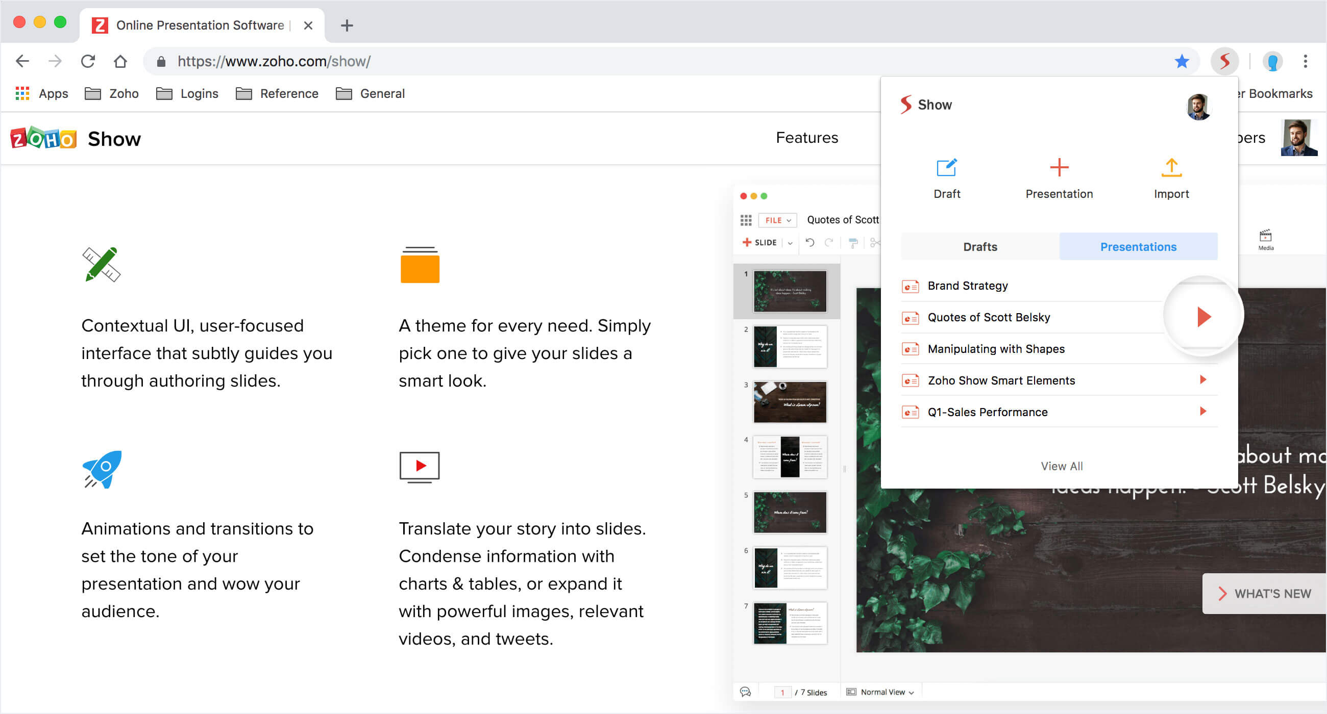 Zoho Show Chrome拡張機能を使用すると、最近のプレゼンテーションに便利にアクセスできます。表示、編集、またはスライドショーを直接ブラウザから再生することができます、あなたの場所を問わず。