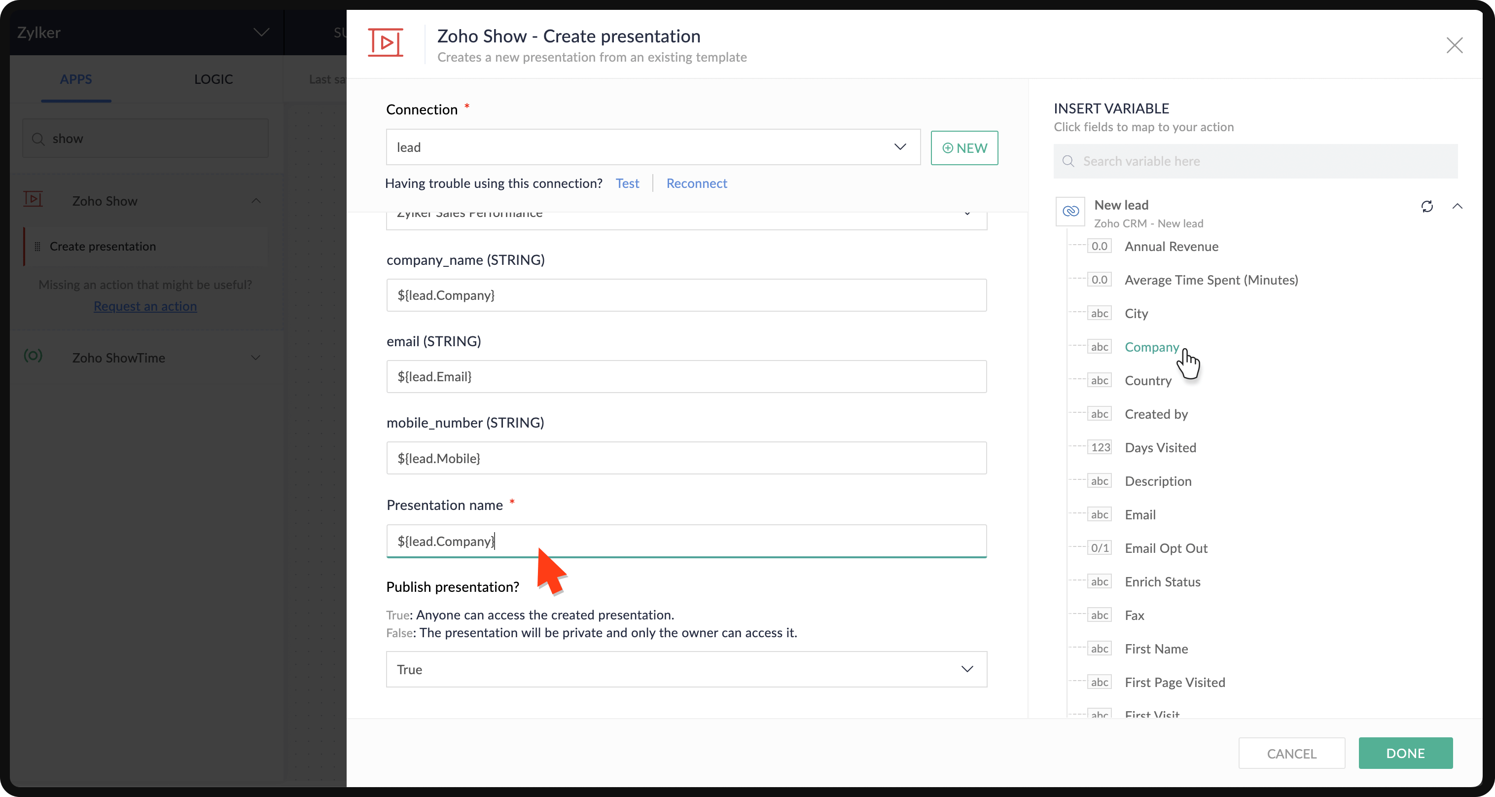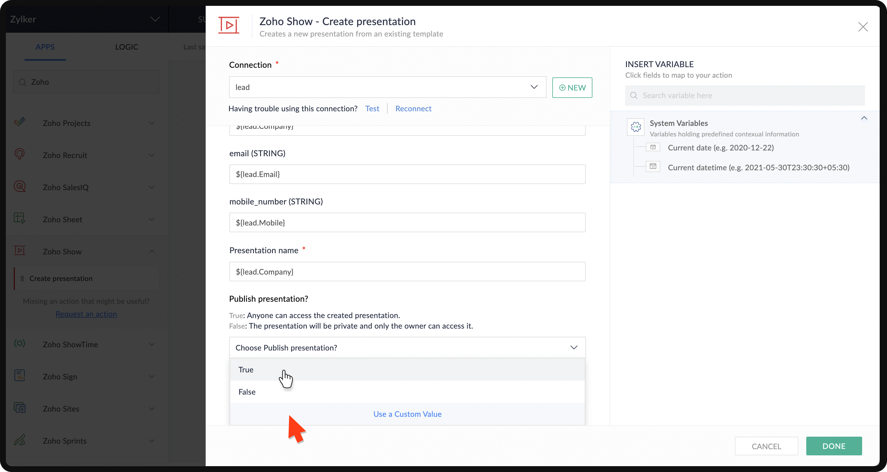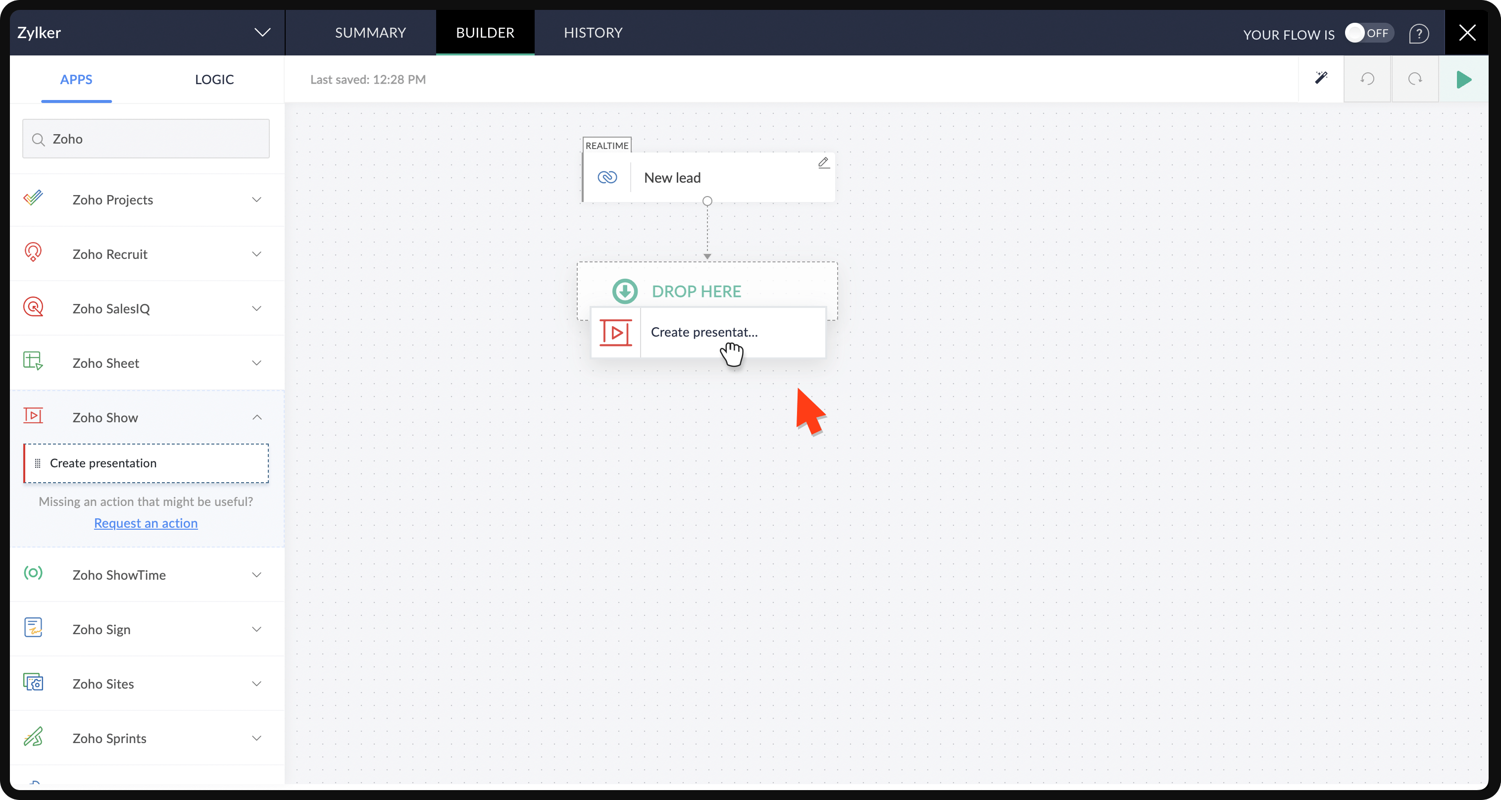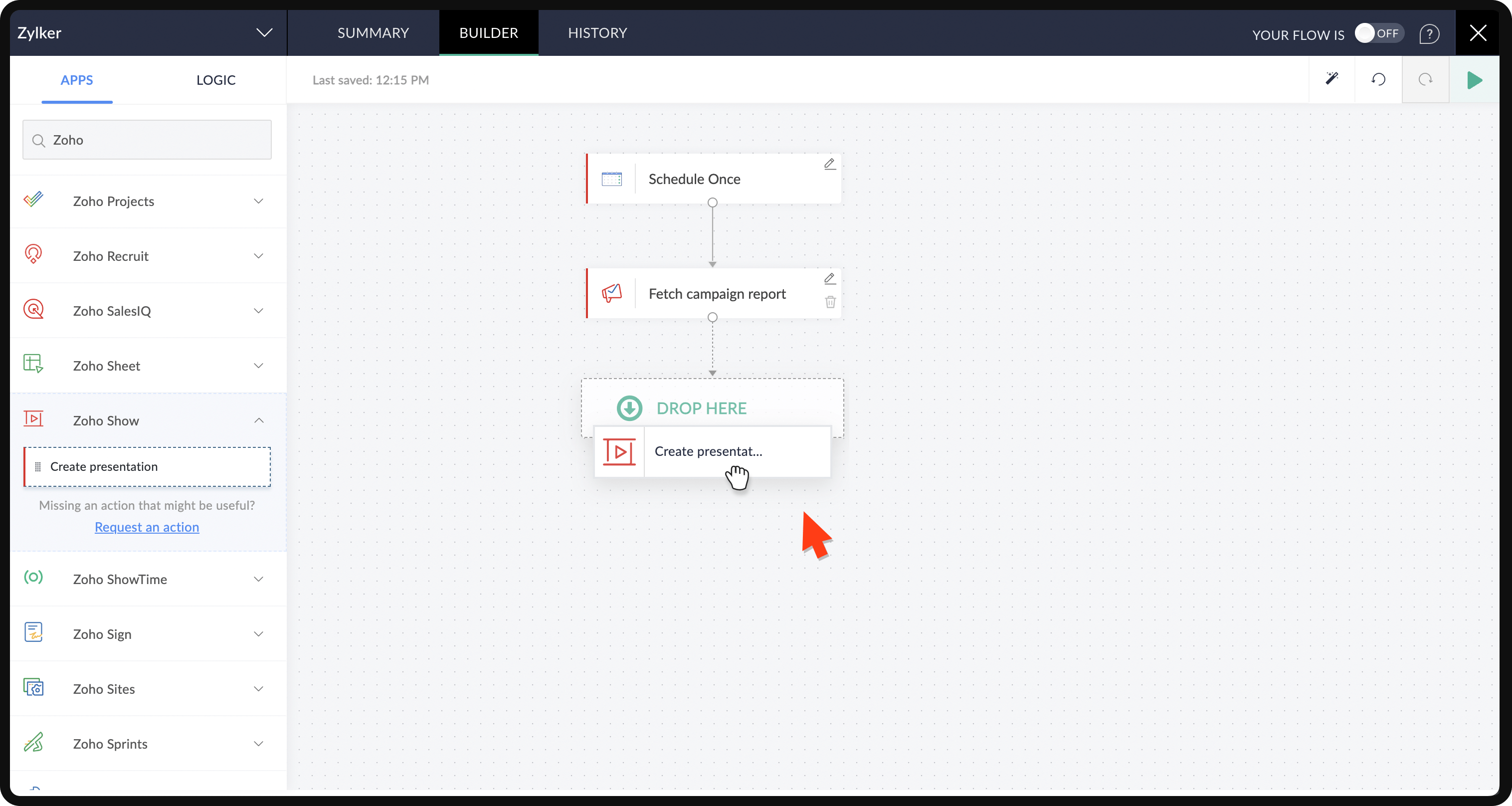 1. ビルダーの左側でZoho Showを検索すると、プレゼンテーションを作成するなどの操作が表示されます。