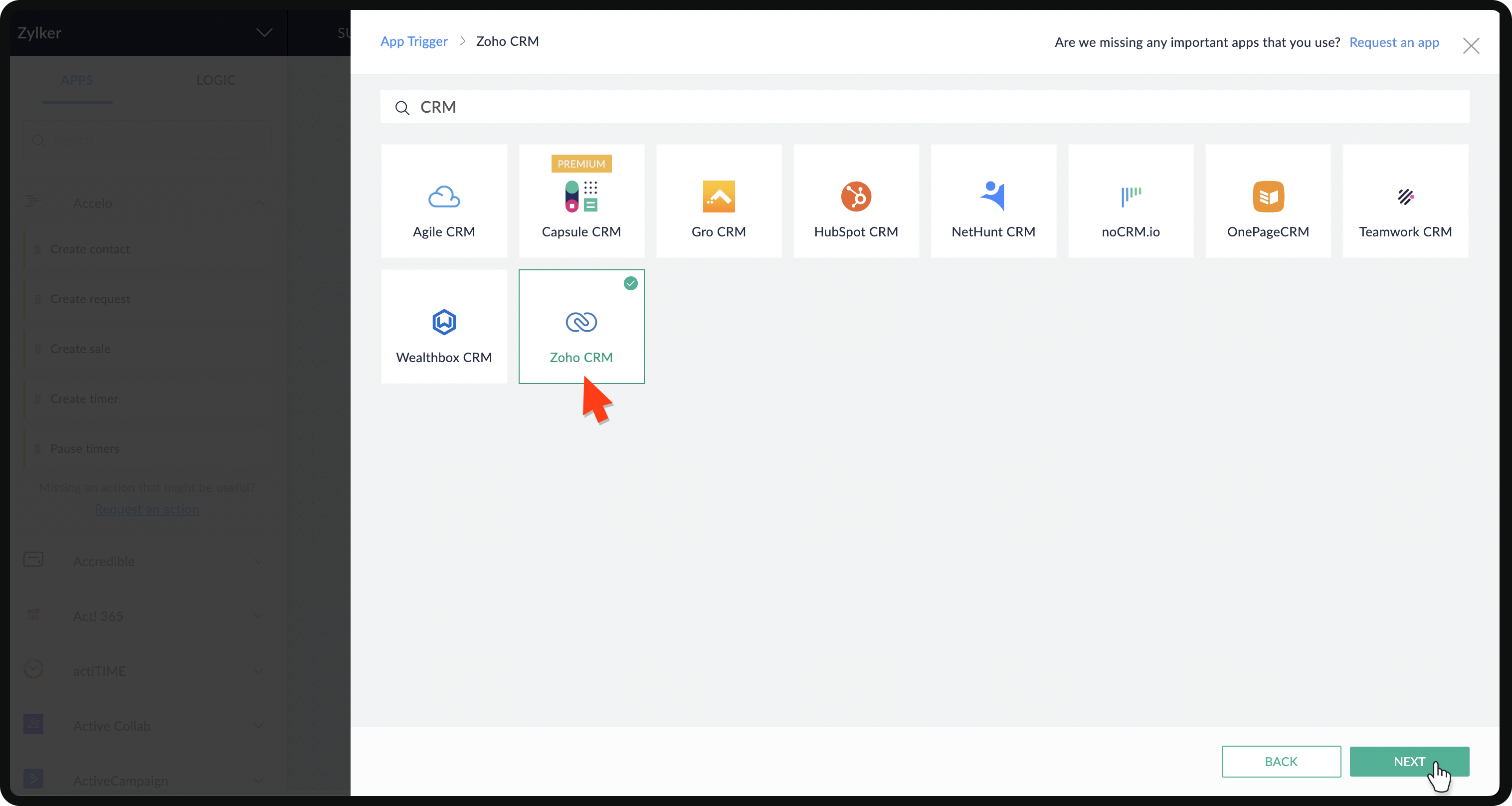 4. 何が流れをトリガーするか選択する画面でAppをクリックし、Zoho CRMを検索してをクリック。