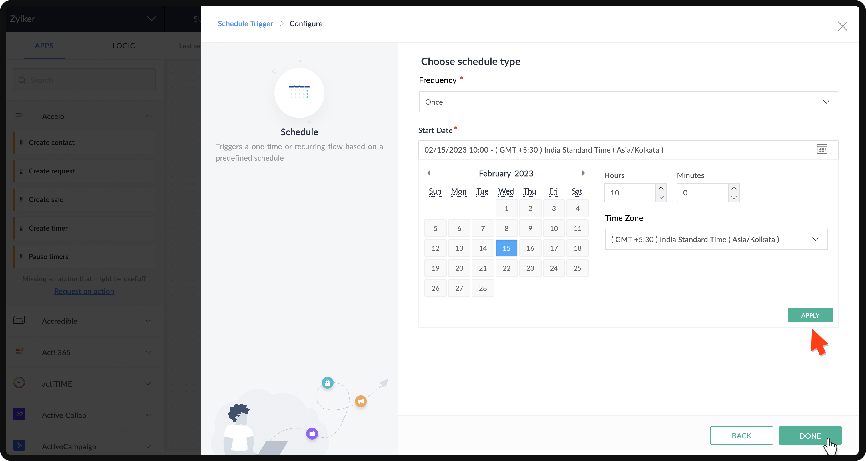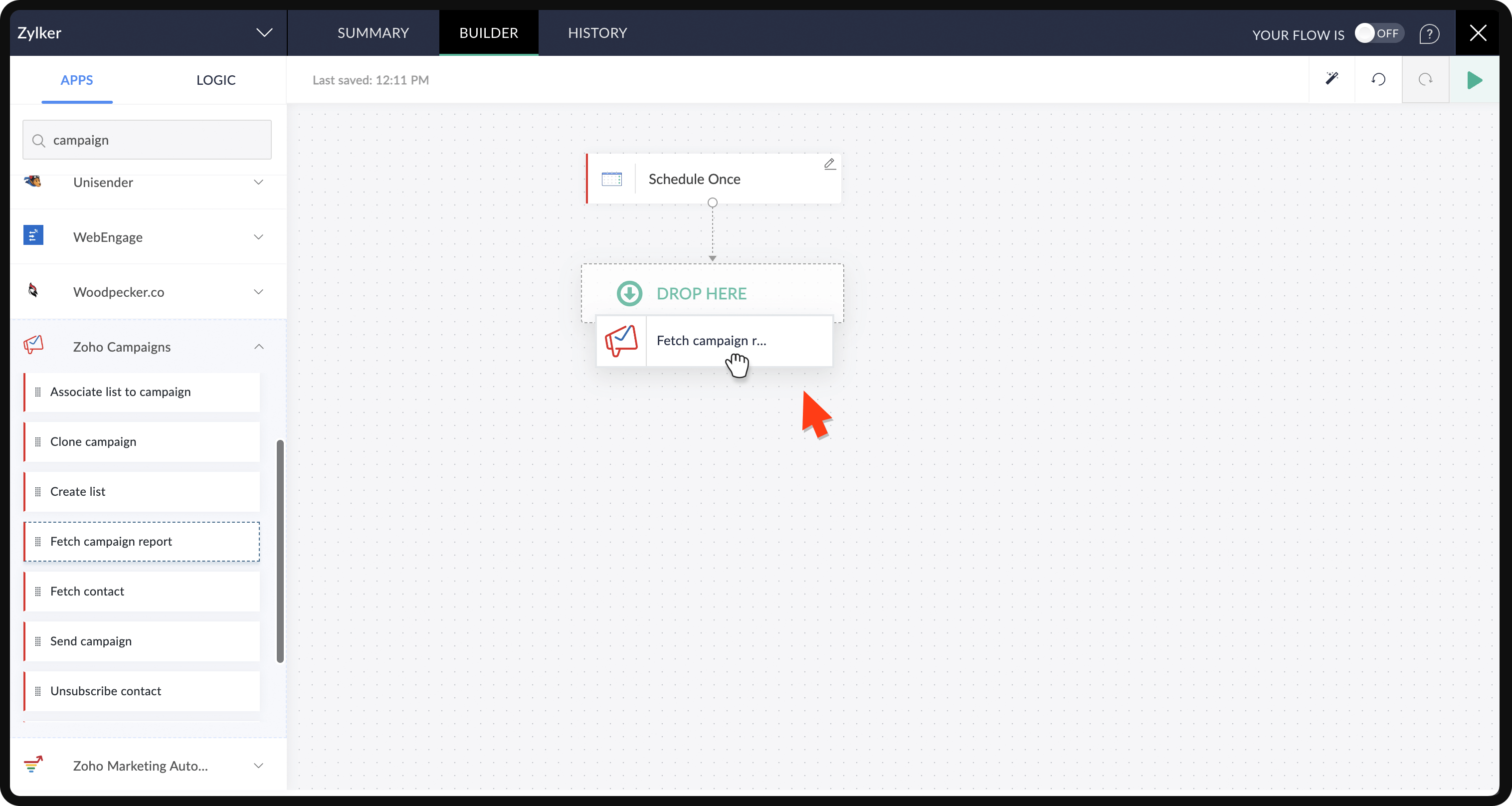 8. Fetch Campaign レポートトリガーをクリックし、それをSchedule Onceの下にドロップします。