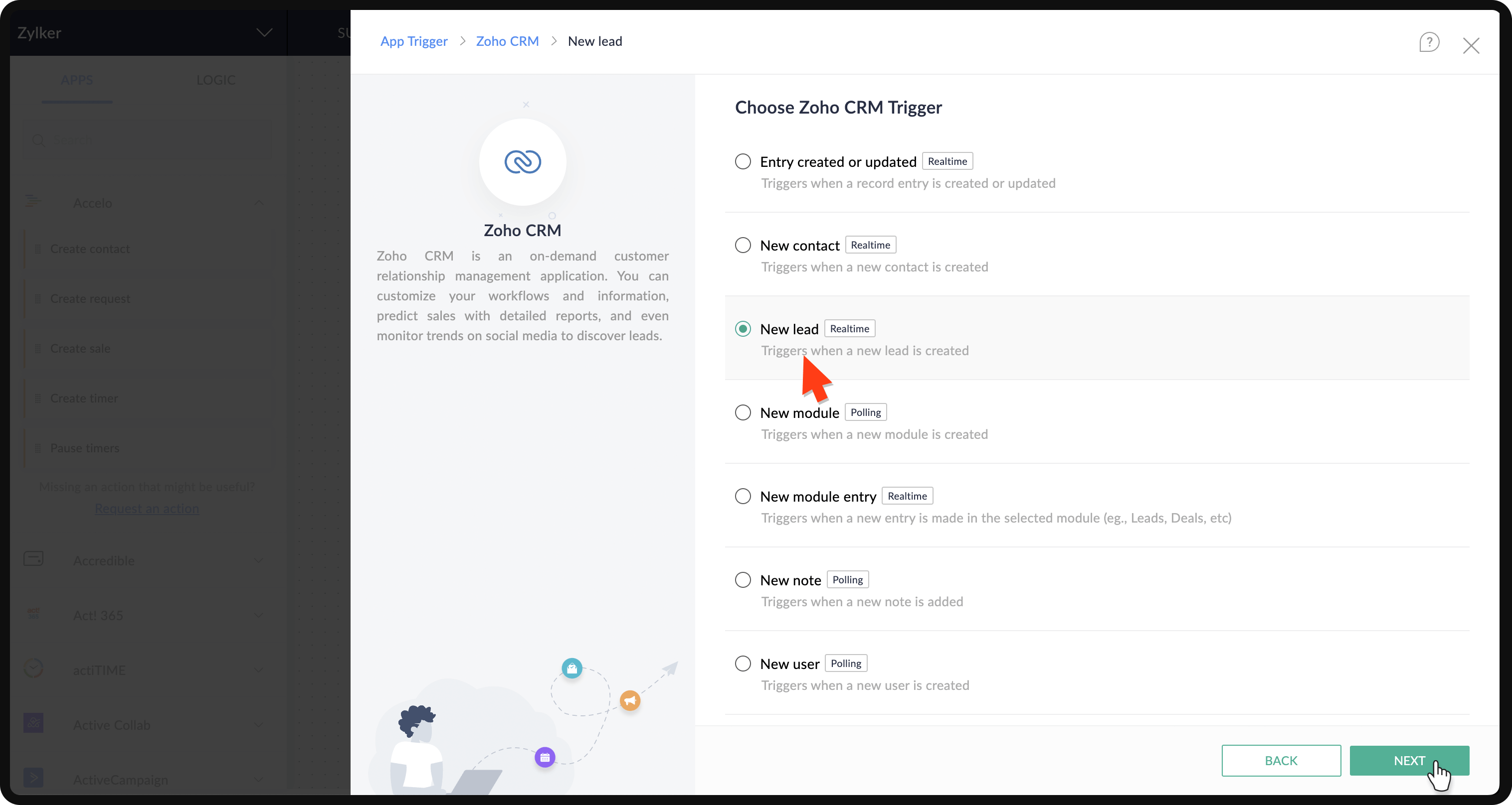 5. Zoho CRMトリガーの新規リードを選択し、をクリック。