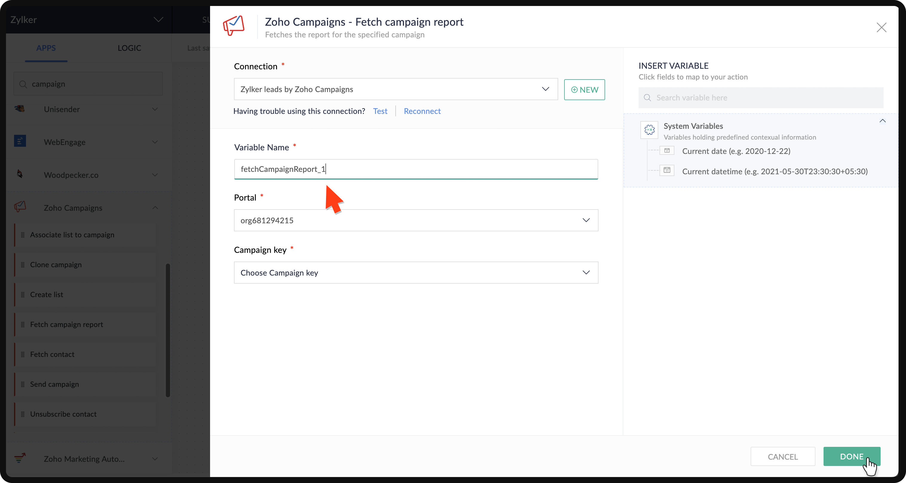 9. Fetch campaign レポート画面から、Connection(接続)を選択し、Variable 名前(変数名)を割り当て、ポータルを選択し、プレゼンテーションテンプレートの名前をCampaign キーで選択します。