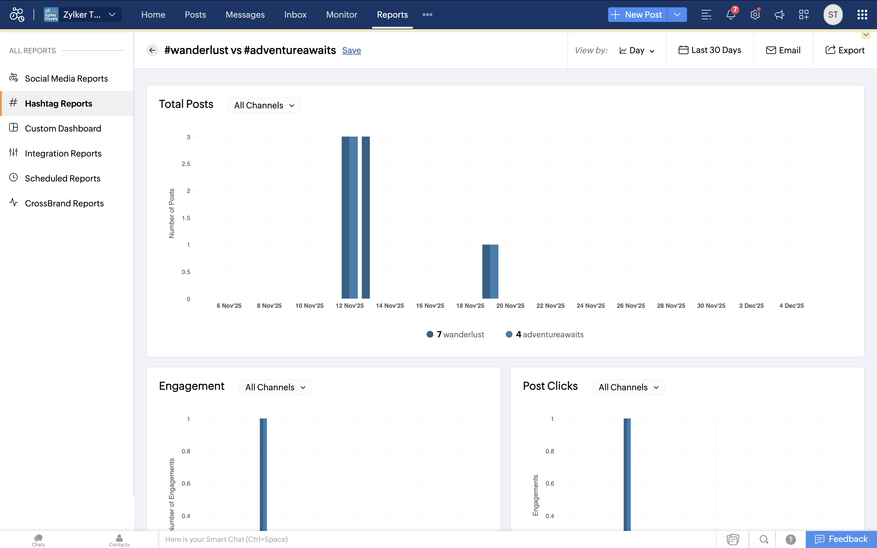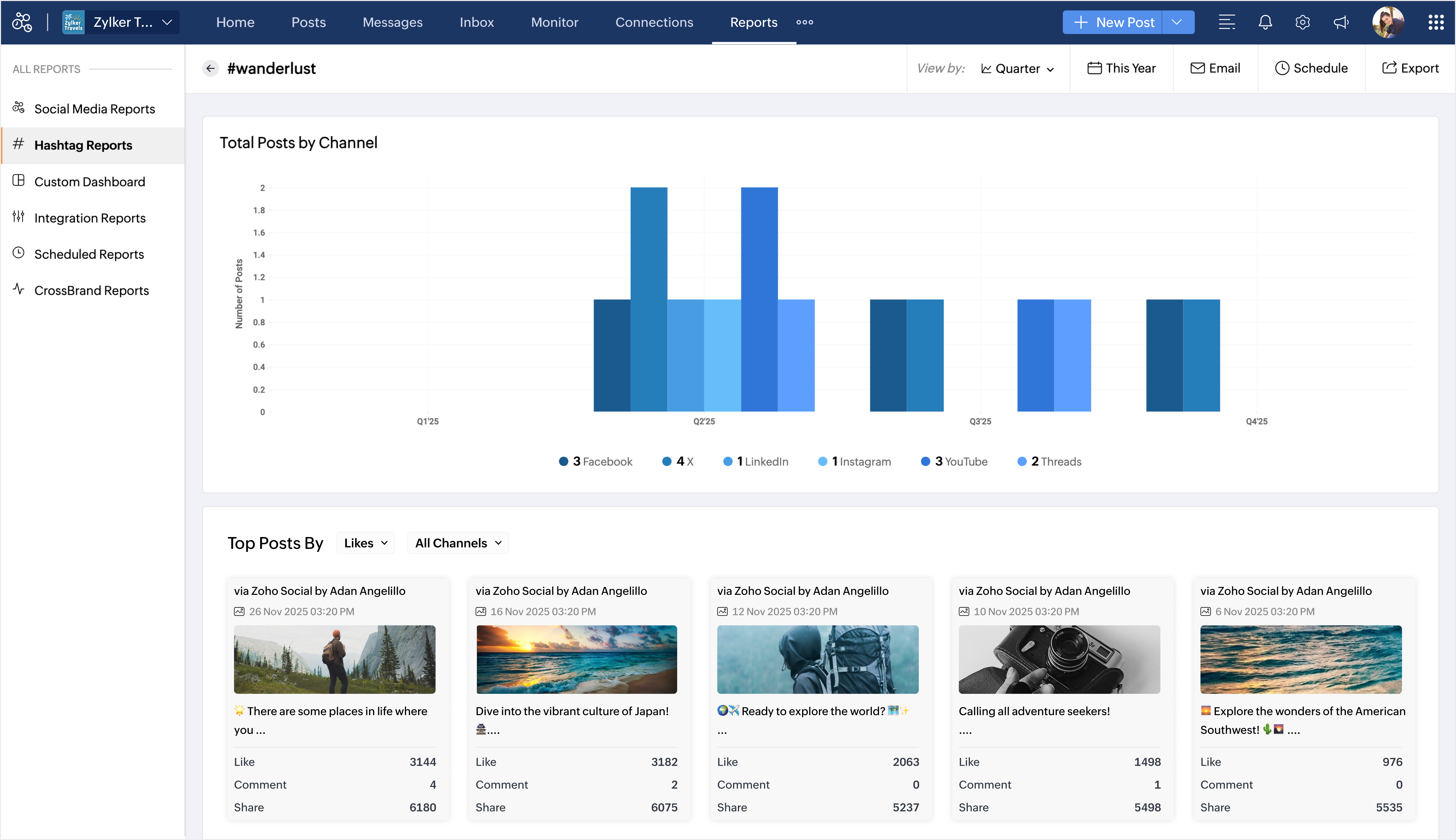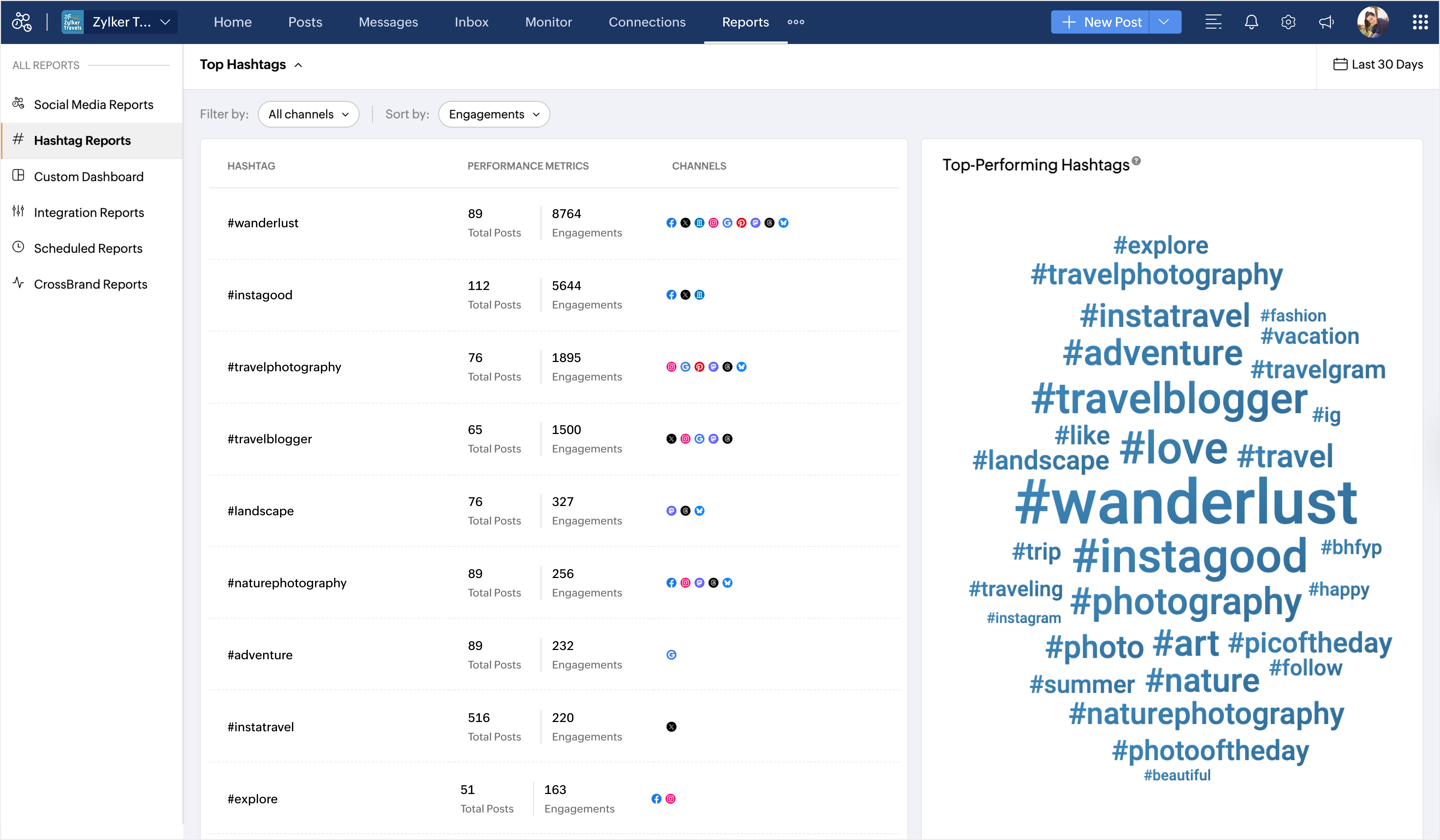 これらのハッシュタグを組み合わせて使用することで、表示回数が増え、ターゲットオーディエンスへのリーチが向上し、Zylker Travelsが適切なタイミングで適切な人々にアプローチできます。